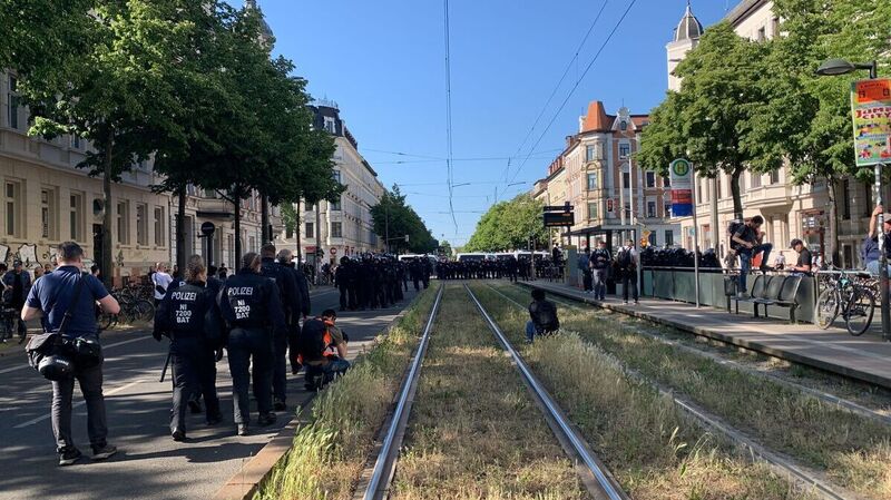Die Polizei bezieht Stellung an der Kurt-Eisner-Straße und blockiert die Straße. Auch Straßenbahnen kommen nicht mehr durch. Unterdessen haben sich gut 1.000 Teilnehmer bei der Demo versammelt, 100 waren angemeldet.