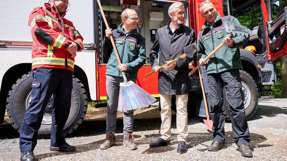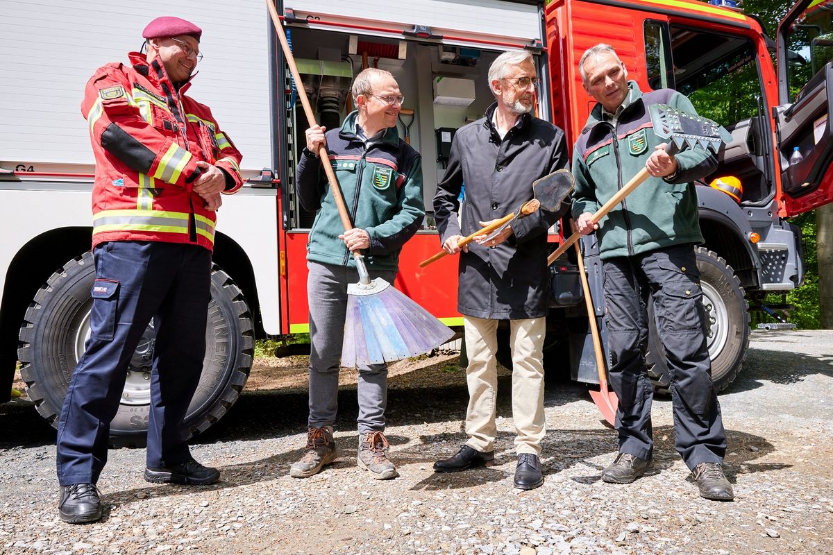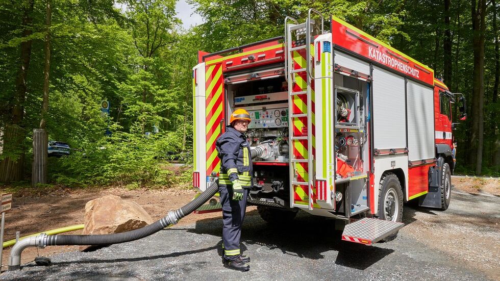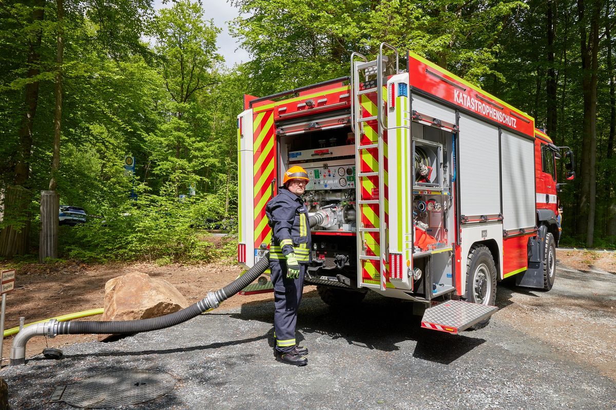 Mit der neuen Technik können die Einsatzkräfte im Falle eines Waldbrandes auf eine schnell erreichbare Löschwasserquelle zurückgreifen. Das verkürzt die Zeit bis zum ersten Angriff erheblich und erleichtert damit den Einsatz der Feuerwehrleute. Im Beisein der Staatsminister Armin Schuster und Wolfram Günther zeigten die Kameraden der Feuerwehr die Funktionsfähigkeit der Anlage.