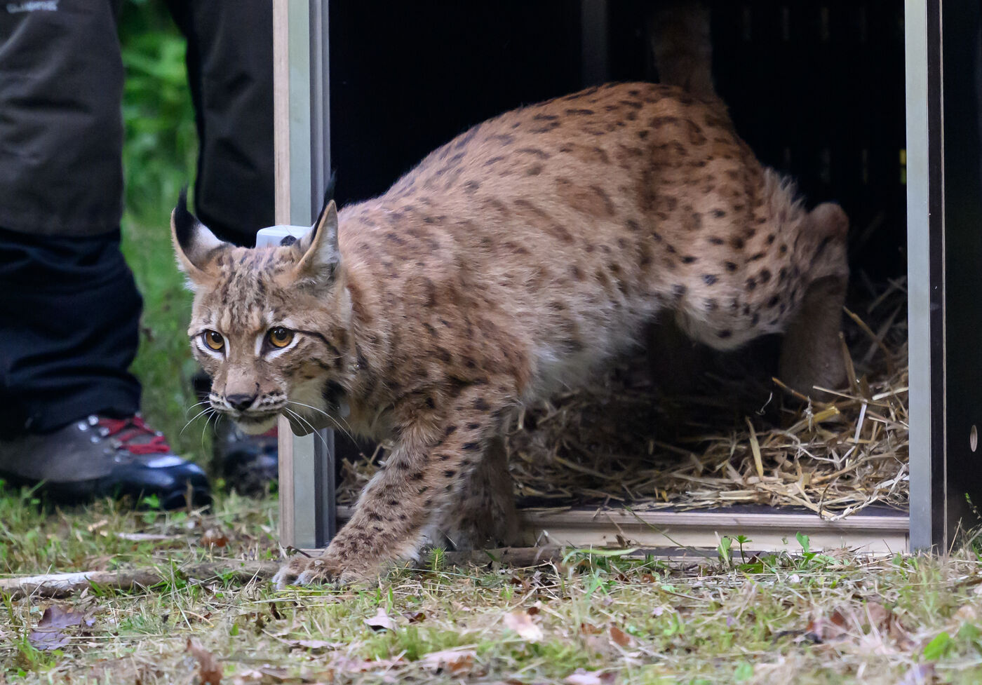 Das Luchsmännchen Charlie verlässt seine Transportbox im Forstbezirk Eibenstock.