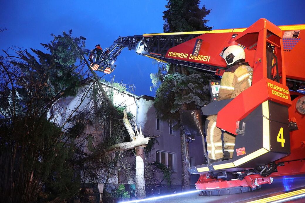 Ein Unwetter mit Sturmböen und Regen ist am frühen Dienstagabend über Dresden und die Landkreise gefegt. Die Feuerwehr hatte zahlreiche Einsätze wegen umgestürzter Bäume oder abgeknickter Äste. Zum Beispiel war auf der Gitterseestraße in Dresden-Plauen eine Fichte auf ein Wohnhaus gekippt. Die Einsatzkräfte sägten den Baum Stück für Stück ab.