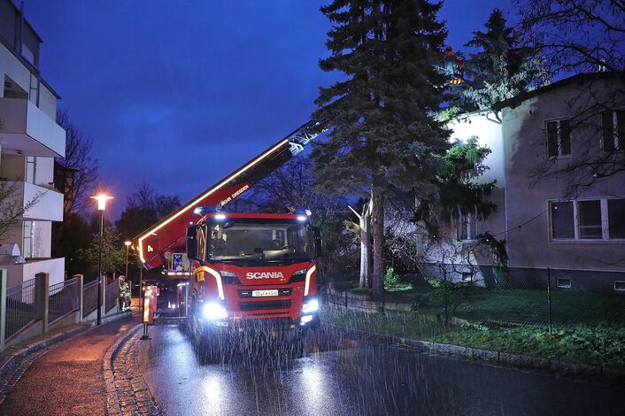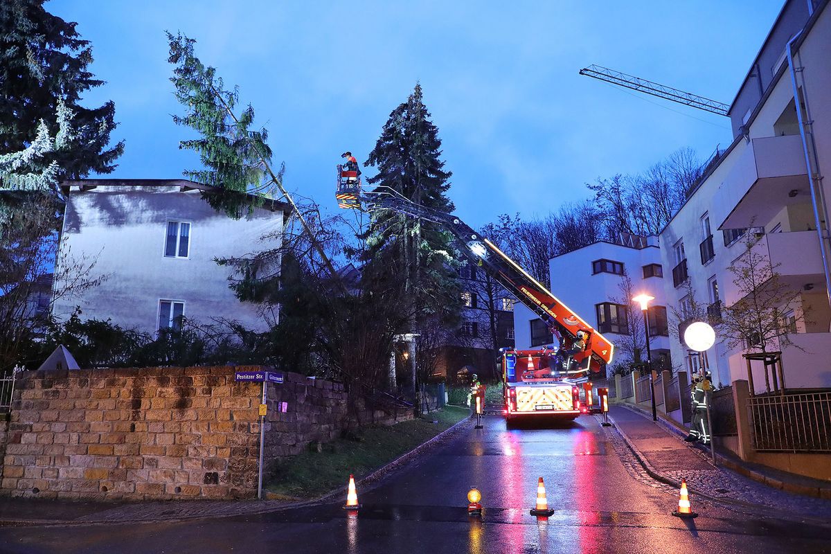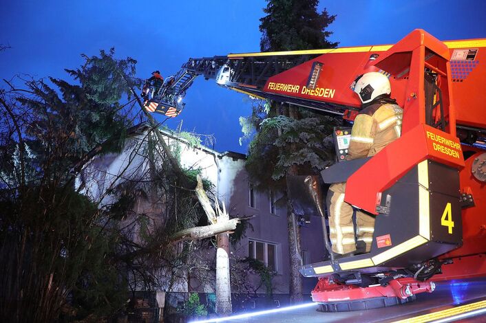 Ein Unwetter mit Sturmböen und Regen ist am frühen Dienstagabend über Dresden und die Landkreise gefegt. Die Feuerwehr hatte zahlreiche Einsätze wegen umgestürzter Bäume oder abgeknickter Äste. Zum Beispiel war auf der Gitterseestraße in Dresden-Plauen eine Fichte auf ein Wohnhaus gekippt. Die Einsatzkräfte sägten den Baum Stück für Stück ab.
