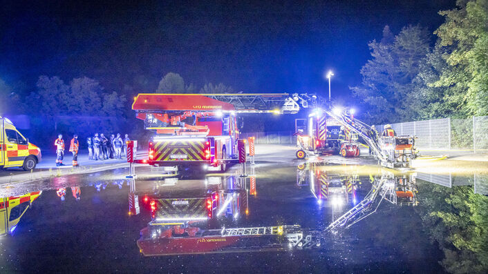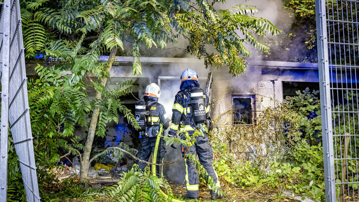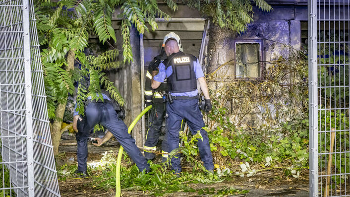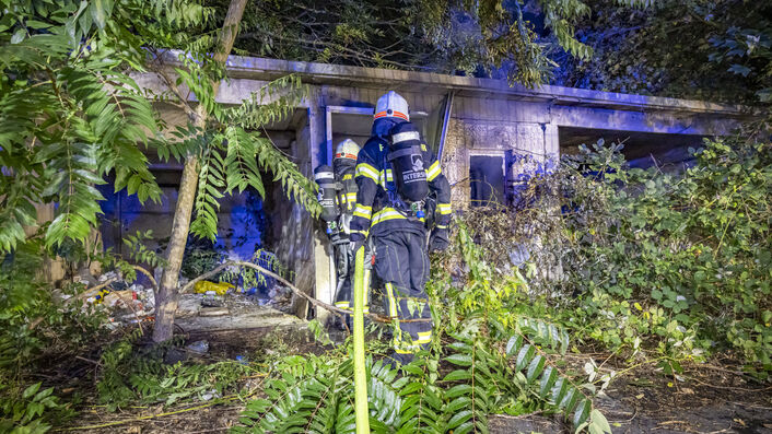 Feuerwehrleute löschen den Brand in dem früheren Garagenkomplex