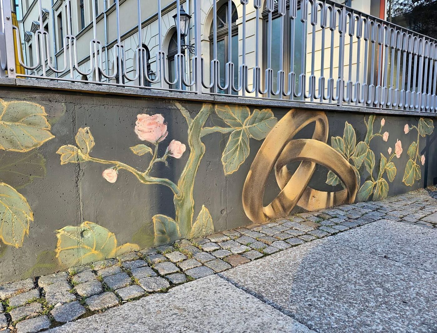 Am Neuberinplatz in Zwickau gibt es einen neuen Fotospot. Graffitikünstler Tobias Förster hat die kleine Mauer neben dem Hochzeitshaus aufgehübscht - im Auftrag des Standesamtes. Das Kunstwerk zeigt passend zum Thema zwei verschlungene Ringe umrahmt von Rosenranken.