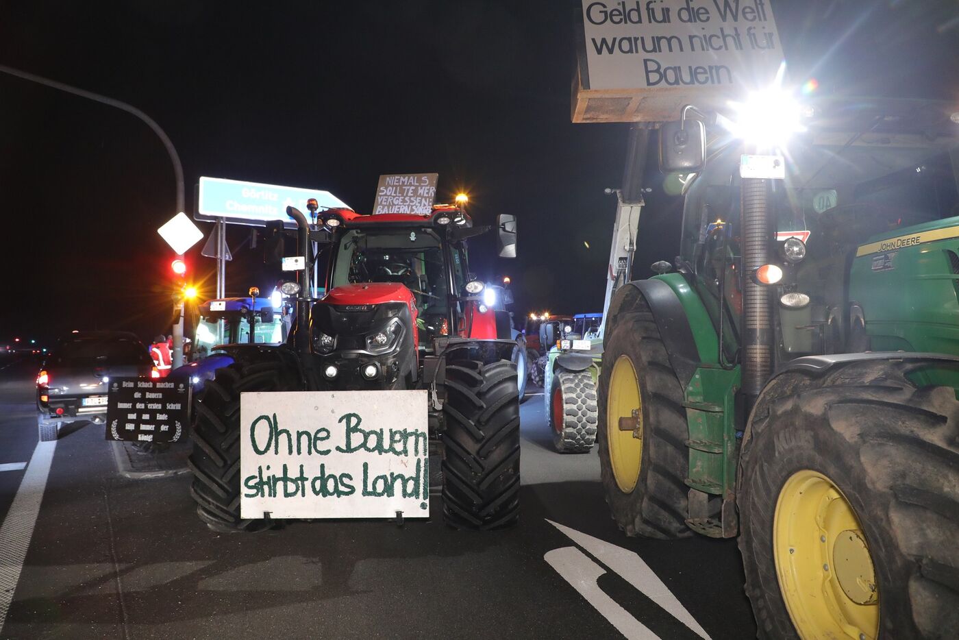 Am frühen Morgen sammelten sich dutzende Landwirte und Bauern nahe der Autobahnausfahrt Radeburg. Es ist die zentrale Sammelstelle für zahlreiche Bauern aus der gesamten Region. Hier wurde untereinander geklärt, wo und mit hunderten Traktoren welche Autobahnauffahrt und Straße blockiert wird. Viele der Fahrzeuge sind passend zum Protest umgestaltet. Kurz vor halb fünf setzte sich die große Kolonne in Bewegen, um zu den besprochenen Blockade-Punkten aufzubrechen. Außerdem startete ein Versammlungsaufzug mit Beteiligung von Lkw auf der B 169 von Zeithain in Richtung Seerhausen.