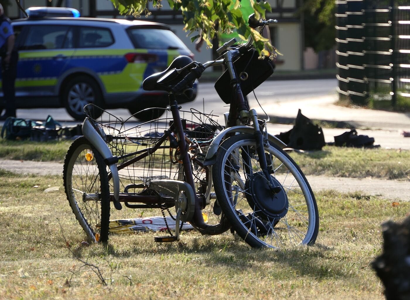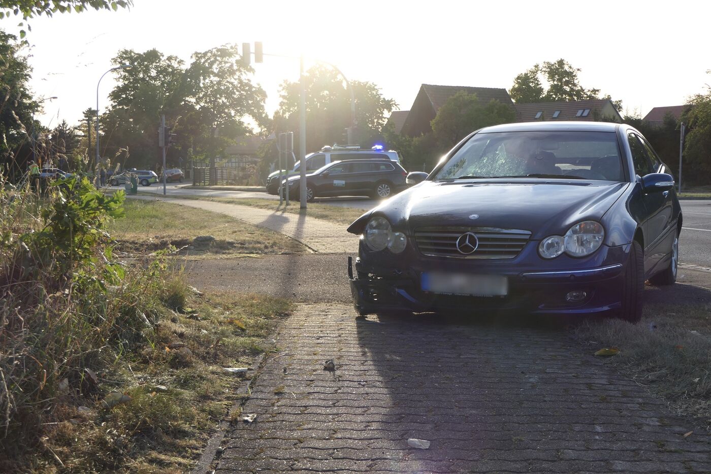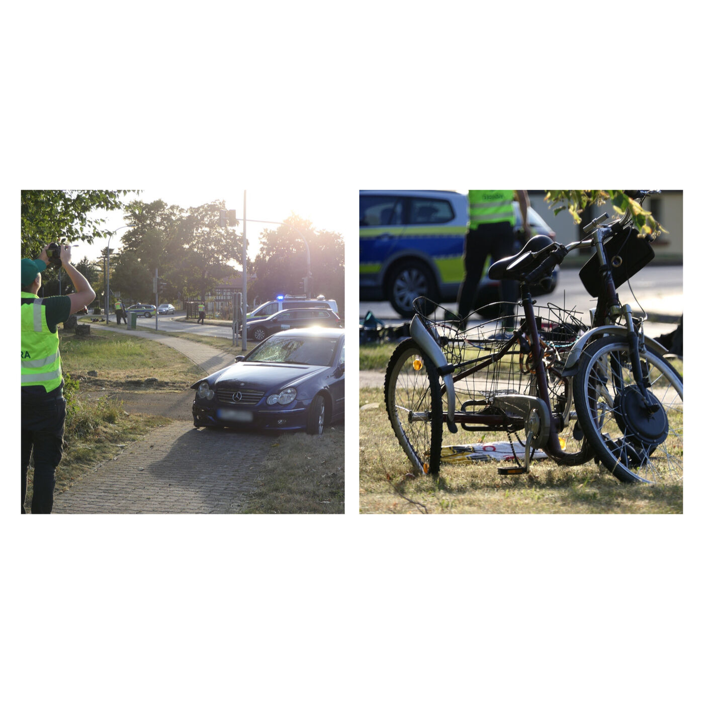 Die beschädigten Fahrzeuge an der Unfallstelle: ein Mercedes und ein (großes) Dreirad.