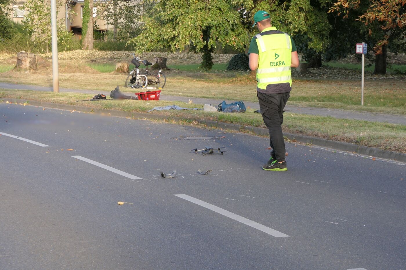 Ein Polizist dokumentiert Trümmerteile auf der Straße.