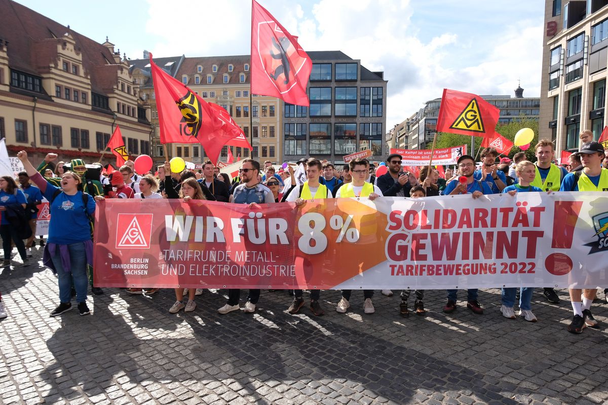 In einer neuen Tarifrunde fordert die Gewerkschaft angesichts der starken Inflation ein deutliches Lohnplus von acht Prozent für die rund 3,9 Millionen Beschäftigten der Branche. Zur Demonstration in der Leipziger Innenstadt waren Beschäftigte mit Sonderzügen aus Chemnitz und Zwickau angereist. „Auch aus Brandenburg und Berlin sind Busse gekommen“, so Sievers. Neben der Bezirksleiterin für Berlin, Brandenburg und Sachsen sprach auch IG-Metall-Chef Jörg Hofmann. „Jetzt ist nicht die Zeit für Zurückhaltung, jetzt ist die Zeit für eine kräftige, tabellenwirksame Erhöhung der Entgelte und Ausbildungsvergütungen“, sagte er.