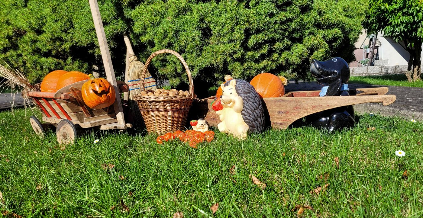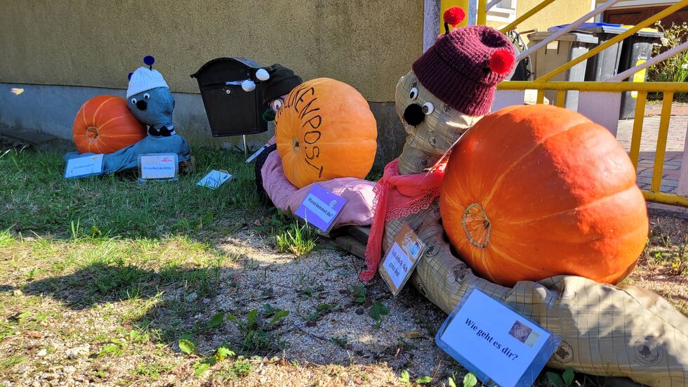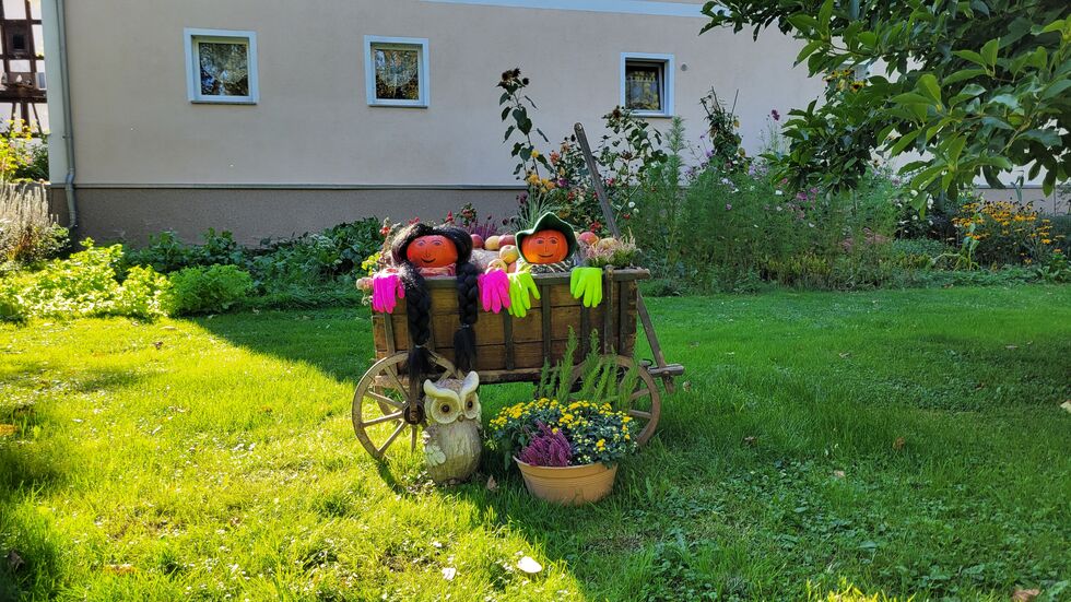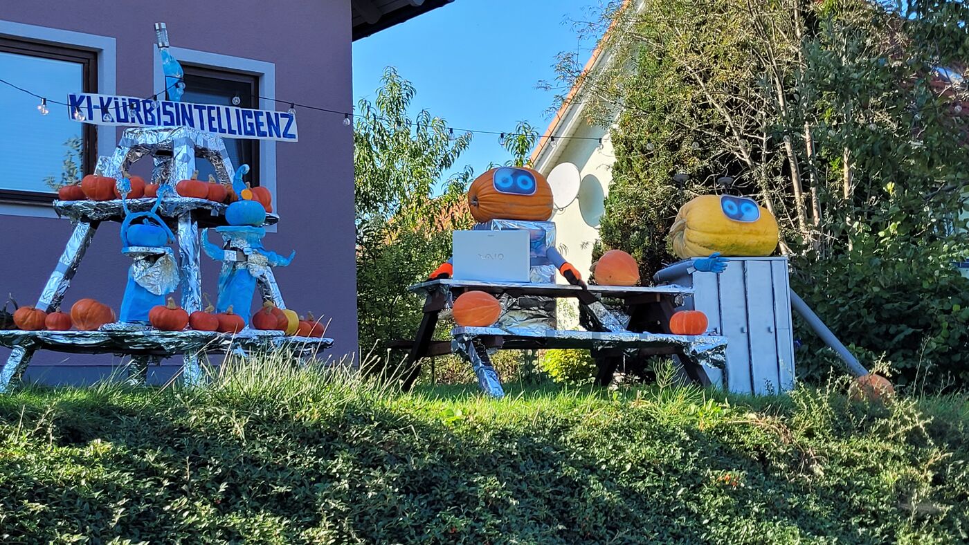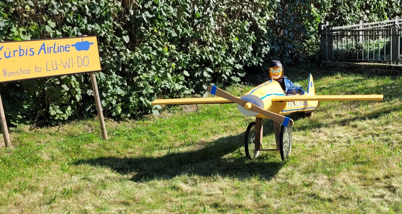In vielen Vorgärten und an Hofeinfahrten haben Einwohner - wie in jedem Jahr - wieder lustige Kürbisfiguren aufgestellt, z.B. einen Flieger, ein Pärchen in der Hängematte und ein ganzer Kürbis-Kindergarten.