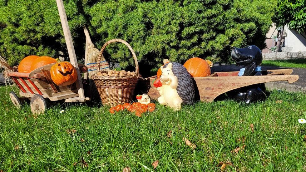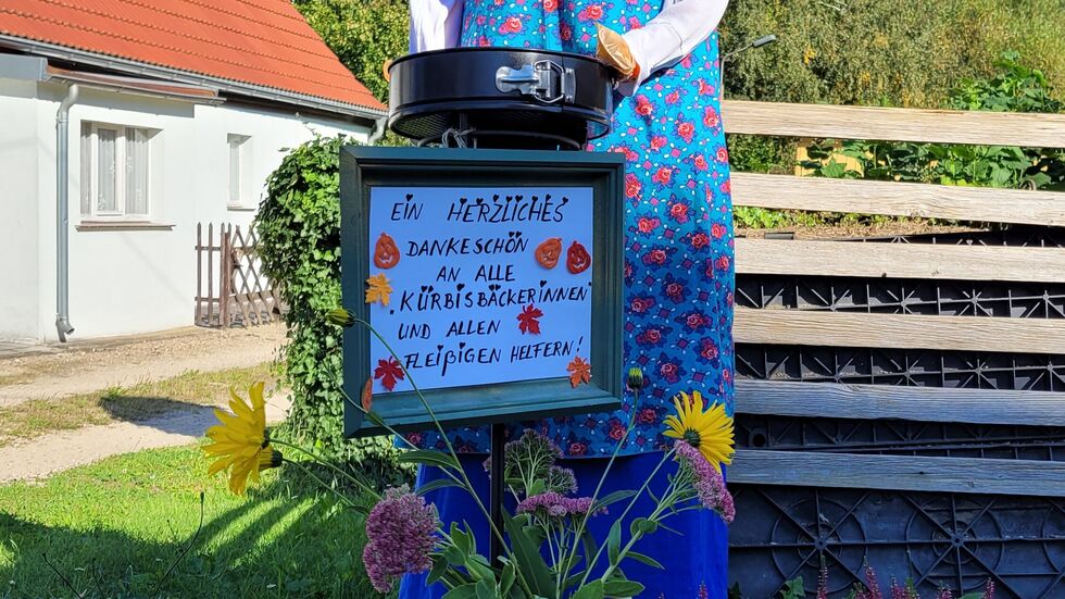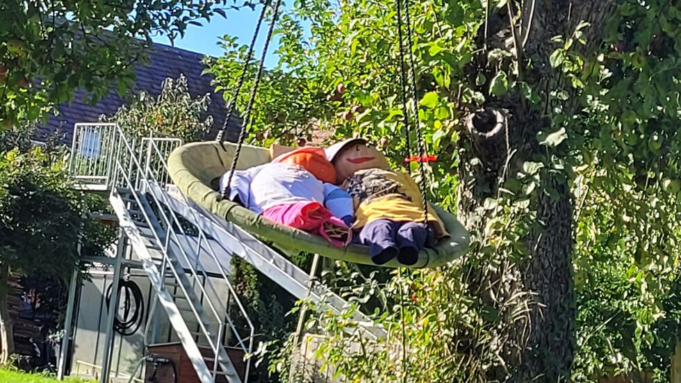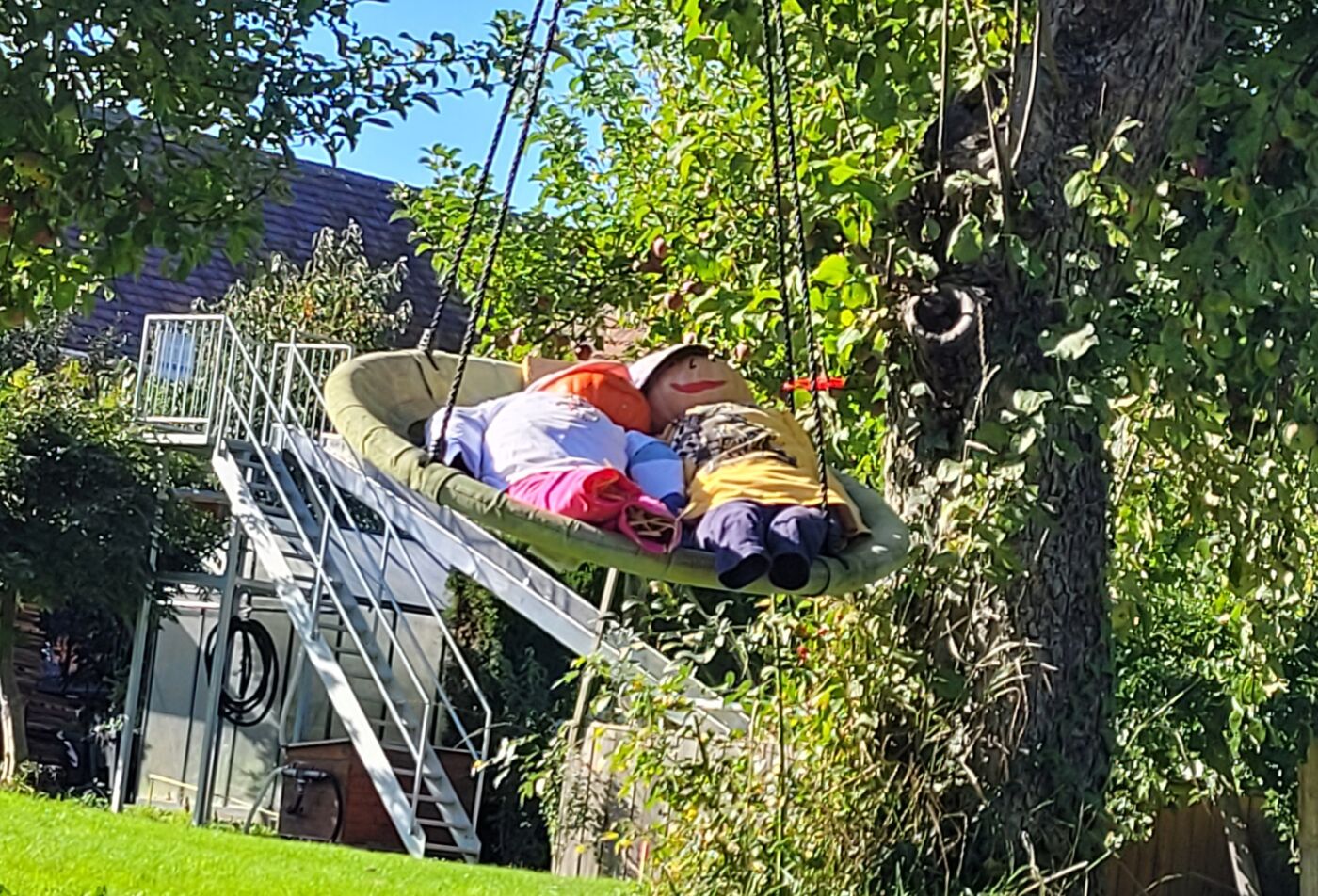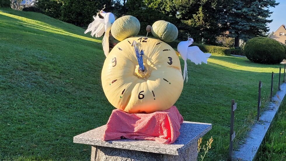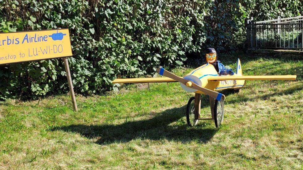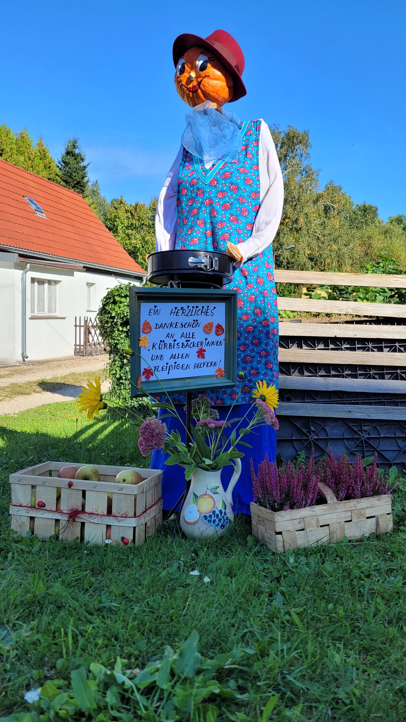 In vielen Vorgärten und an Hofeinfahrten haben Einwohner - wie in jedem Jahr - wieder lustige Kürbisfiguren aufgestellt, z.B. einen Flieger, ein Pärchen in der Hängematte und ein ganzer Kürbis-Kindergarten.