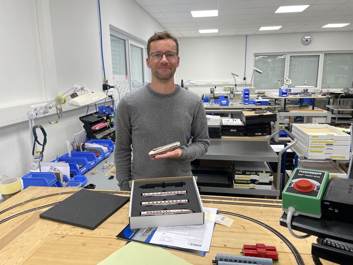 Geschäftsführer Sebastian Fischer mit einem Modell eines Dieseltriebwagens (VT18.16 Bauart Görlitz), der als Highlight der ostdeutschen Eisenbahngeschichte gilt.