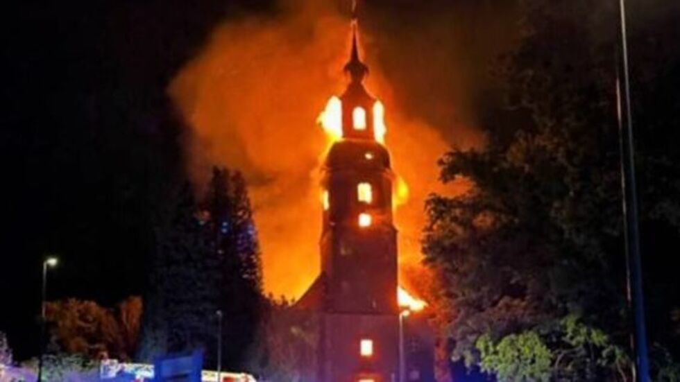 In der Nacht zum 4. August hatte ein Feuer die Barockkirche der Kleinstadt zur Ruine gemacht. Die Flammen zerstörten Dachstuhl, Kirchenschiff und einen Teil des 50 Meter hohen Glockenturms. Viele historische Kunstschätze und Architekturteile sind verloren, darunter Taufstein und -schale, Kanzel, Orgel, Emporen sowie die geschnitzte Madonna aus dem 15. Jahrhundert und eine Nachbildung des Altars der Leipziger Thomaskirche.
