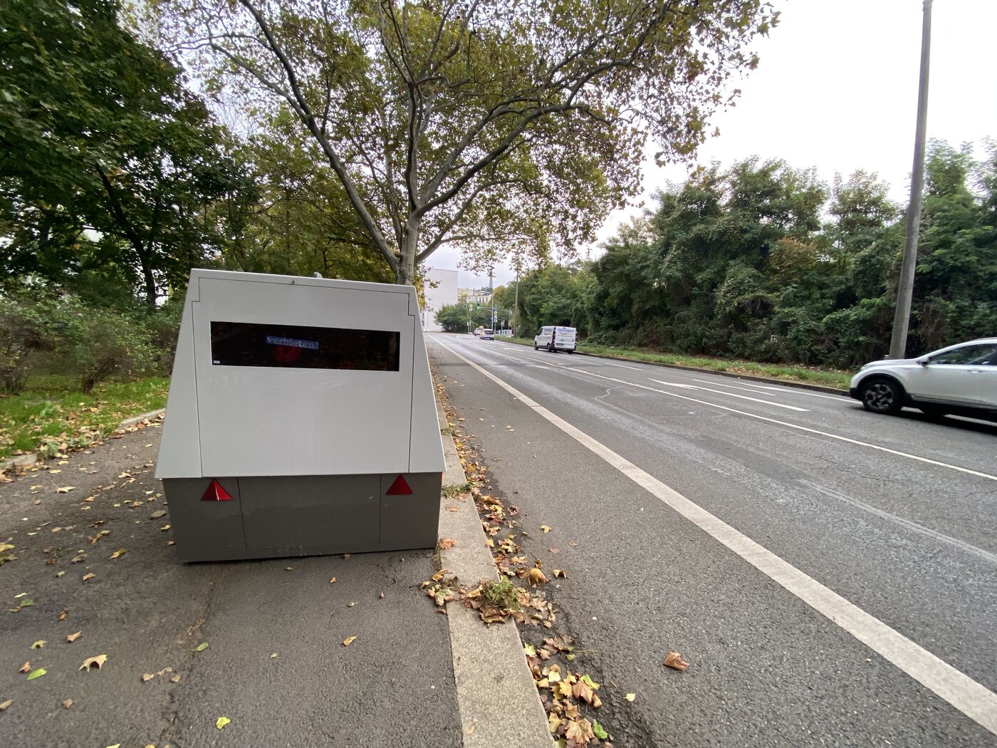 Auf dem mobilen Blitzgerät hat jemand bereits einen Aufkleber hinterlassen.