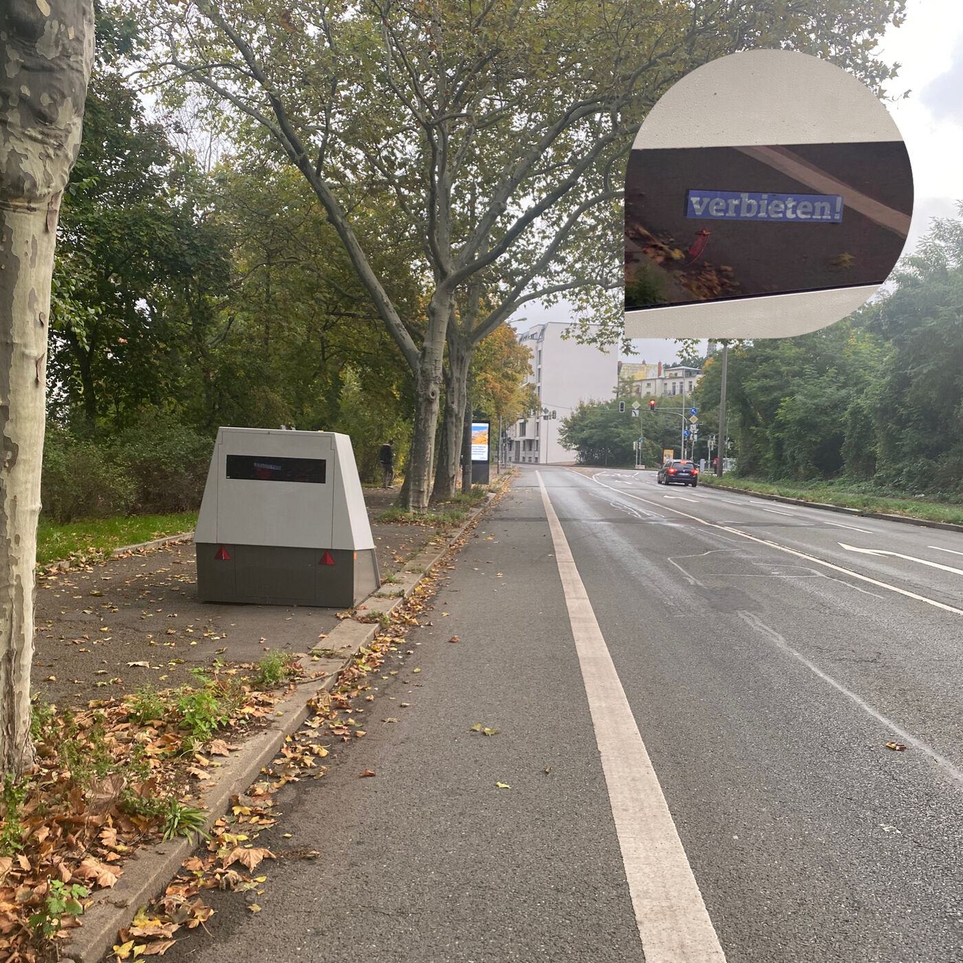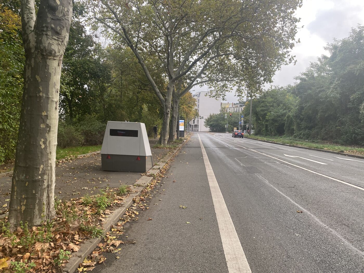 Der Superblitzer steht auf der Wundtsraße in Leipzig stadteinwärts links auf dem Fußweg - kurz vor der Kreuzung Dufourstraße.