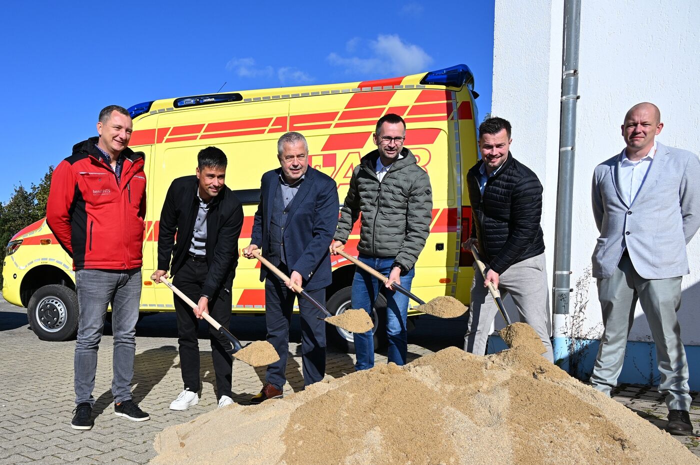 (v.l.n.r.): Gunnar Stary, Geschäftsführer bendl HTS; Oliver Thomas, Geschäftsführer Bauplanconcept Ingenieure GmbH; Landrat Michael Geisler; Alexander Penther, Geschäftsführer ASB; Alexander Sachse, Bürgermeister Neustadt i. Sa.; Paul Krell, Leiter ASB-Rettungsdienst