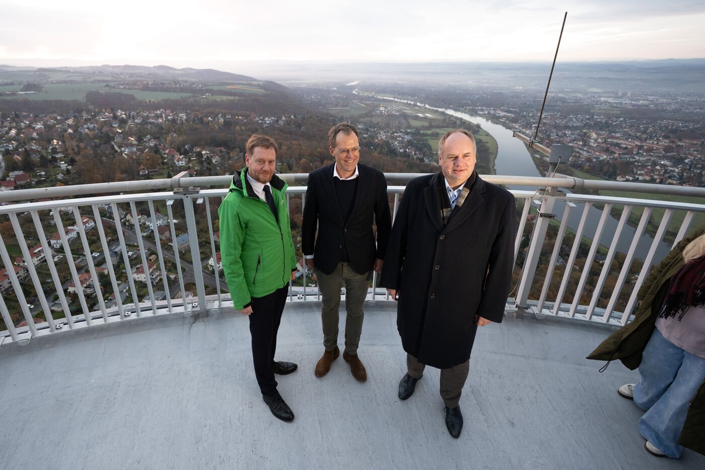 - Ministerpräsident Kretschmer, Funkturm-Betreiber Kollecke und OB Hilbert (v.l.n.r.) luden auf die Aussichtsplattform