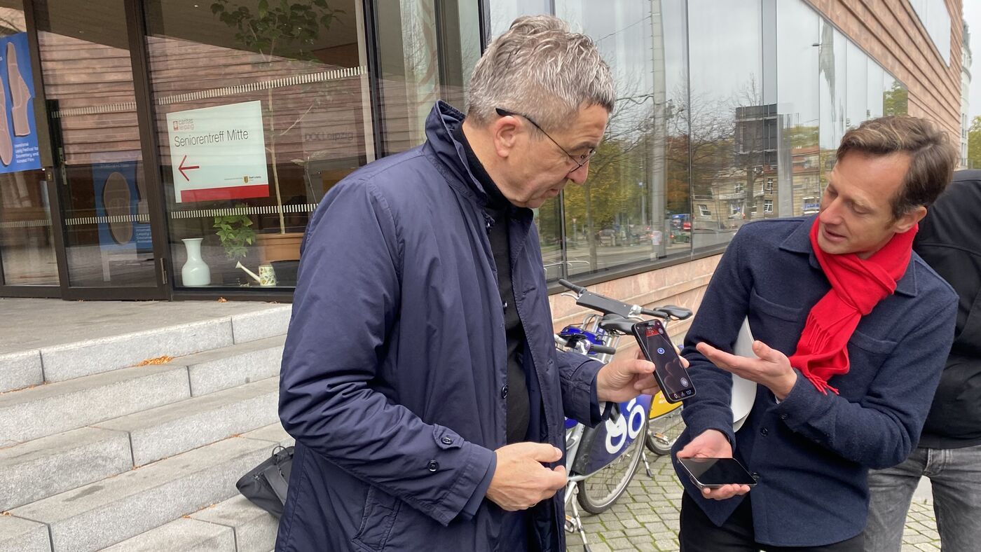Leipzigs Baubürgermeister Thomas Dienberg (li.) mit Sebastian Lindhorst (Chef der der Abteilung für Verkehrssicherheit und Beleuchtung des Mobilitäts- und Tiefbauamtes) bei der Vorstellung der neuen App am Dienstagvormittag in Leizig.