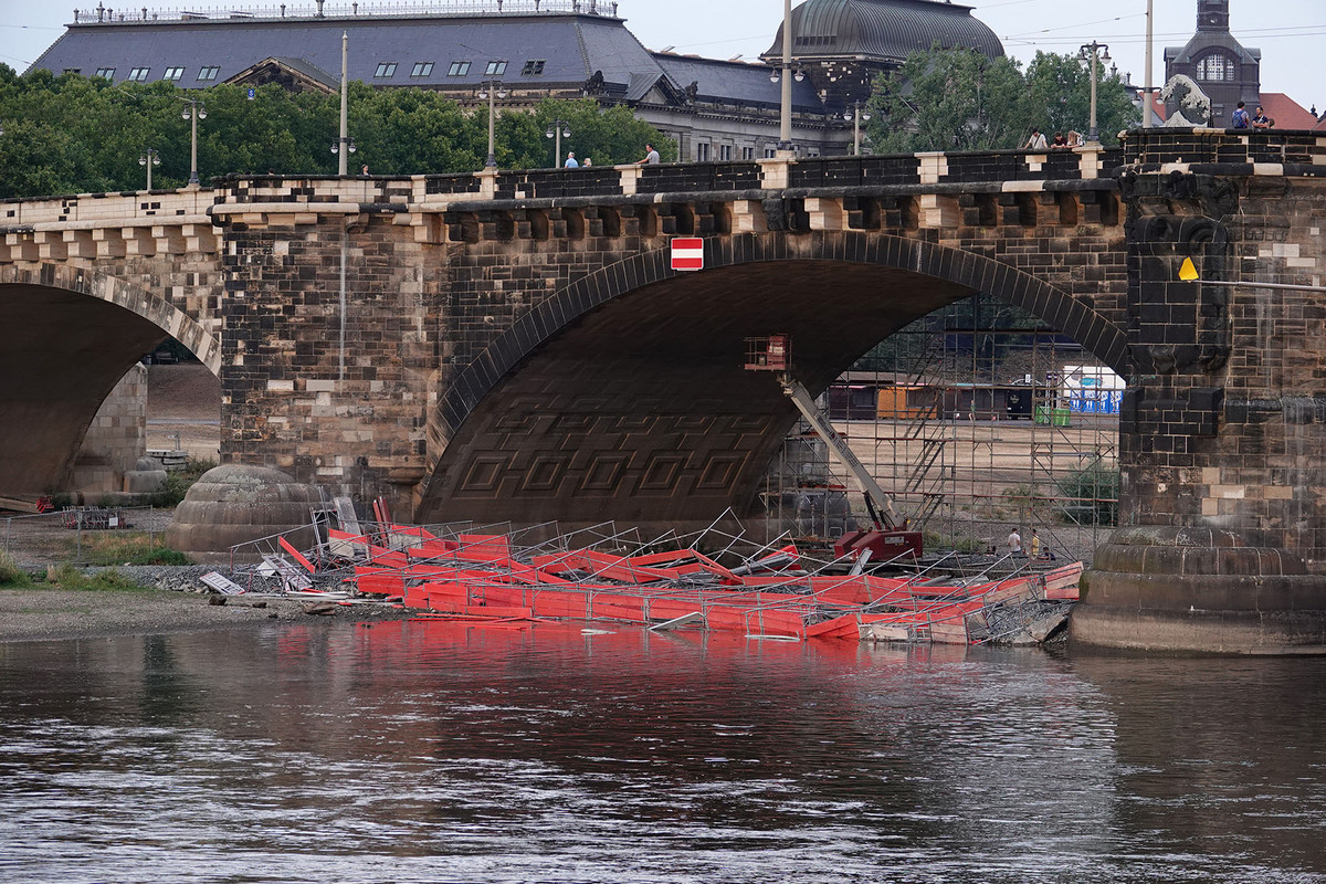 - An der Augustusbrücke kippte ein Baugerüst in die Elbe.