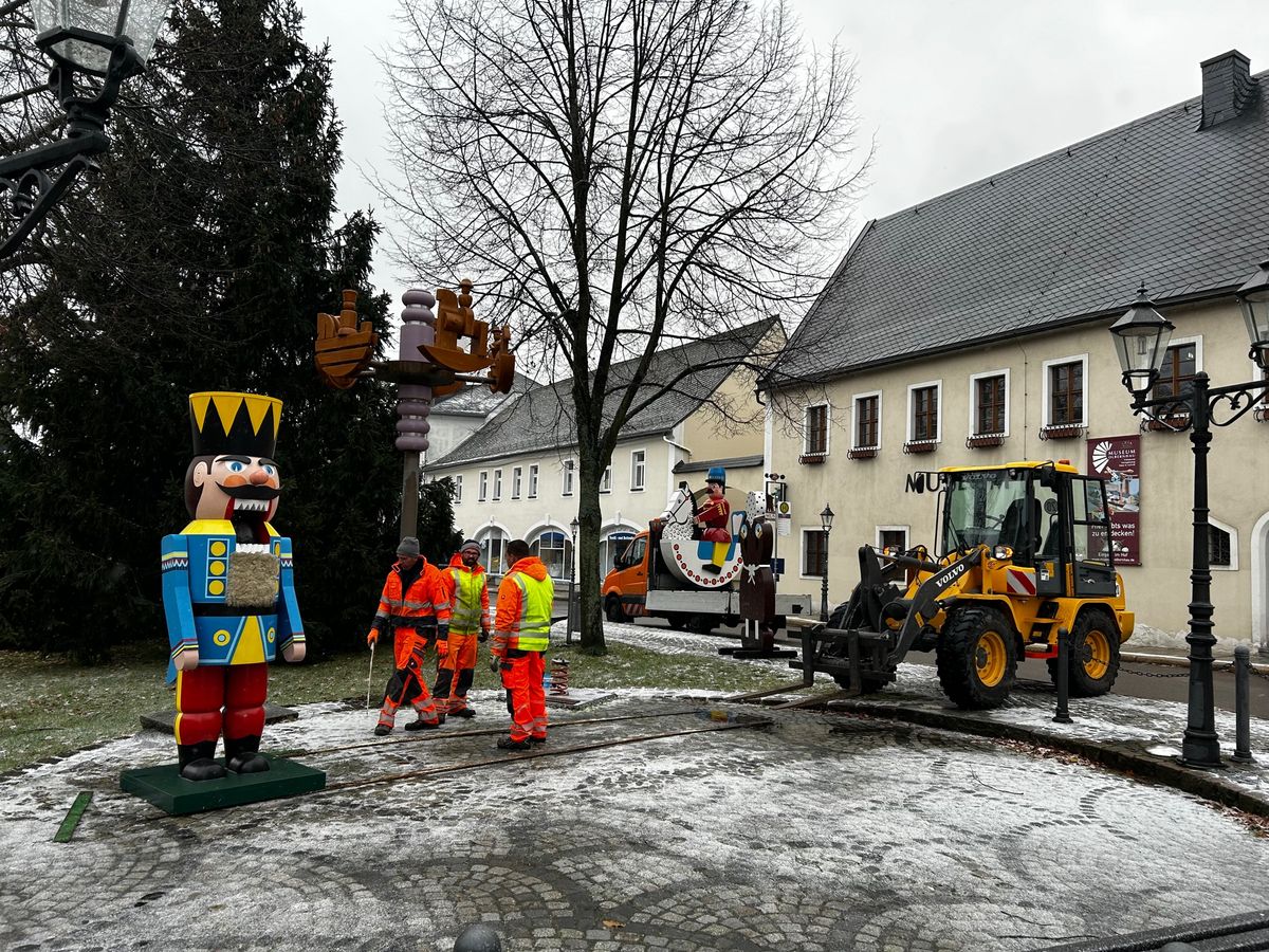 Die Symbolfiguren der Stadt, Nussknacker, Reiterlein und Pfefferkuchenfrau, kommen an ihren Platz.