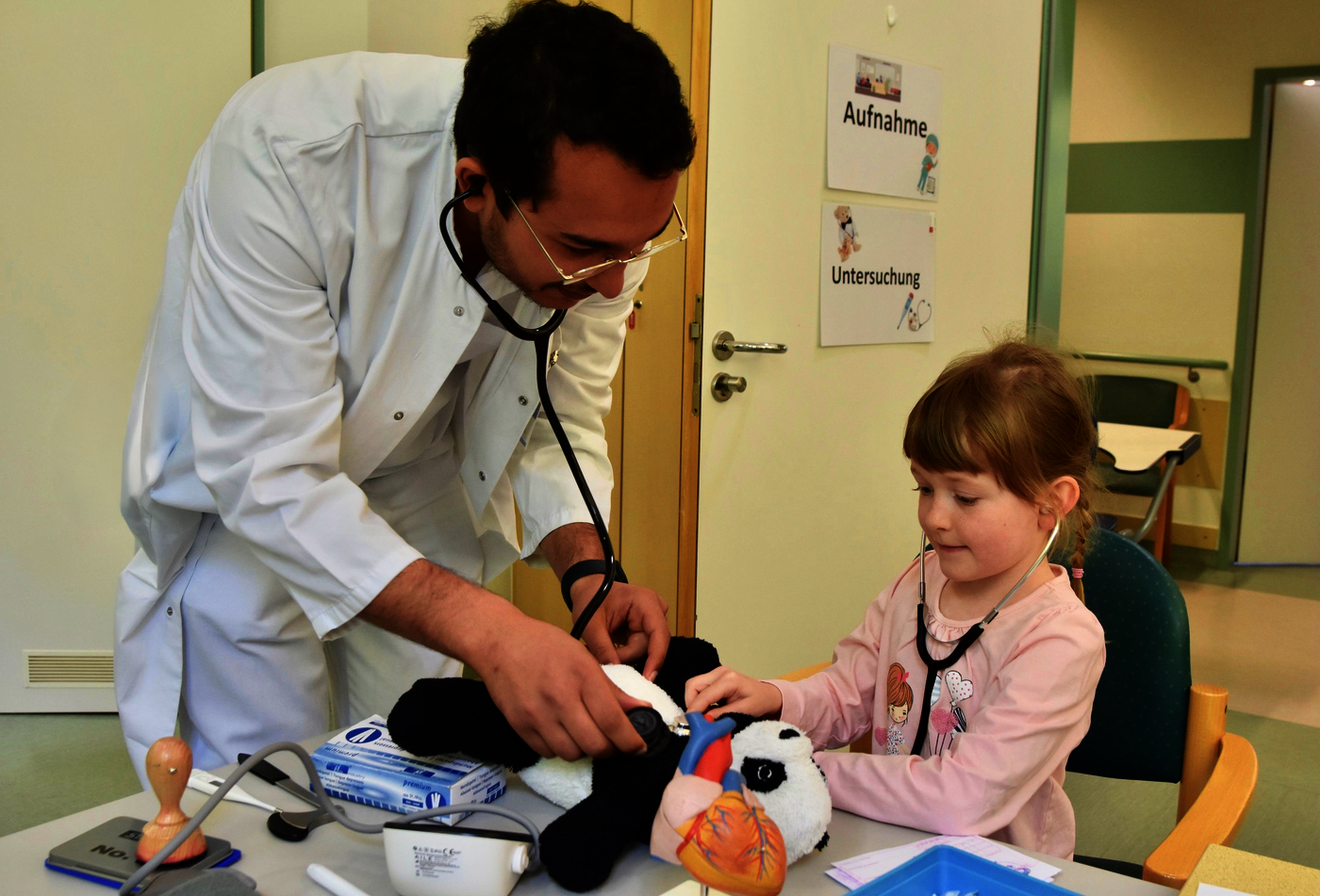 Mit ernster Miene legt das kleine Mädchen das Stethoskop an den Bauch ihres Stoffpandas. Neben ihr hilft ein junger Arzt im weißen Kittel. „Hörst du das Herz schlagen?“, fragt er lächelnd. Sie nickt – ganz konzentriert. Szenen wie diese spielten sich im Haus 11 des Klinikums Chemnitz ab, das sich am Samstag wieder in eine Teddyklinik verwandelte.