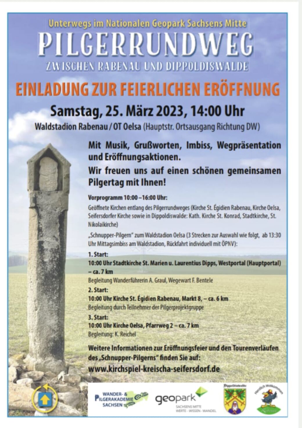 Im Landkreise Sächsische Schweiz-Osterzgebirge gibt es einen neuen Pilgerrundweg. Samstagnachmittag 14 Uhrwird er feierlich im Waldstadion Rabenau/Oelsa, eingeweiht. Entlang der 40 Kilometer langen Strecke von Rabenau über Seifersdorf, Malter, Dippoldiswalde, Elend, Reinholdshain und Oelsa gibt es jede Menge zu entdecken. 23 historische Wegemale, darunter 6 Kirchen können erkundet werden. An jeder Station gibt es Denkanstöße – so genanntes Gedankenfutter - damit die Pilger vorankommen: mit den Beinen und mit der Seele, so Doreen Kadner vom Fremdenverkehrsamt Rabenau.