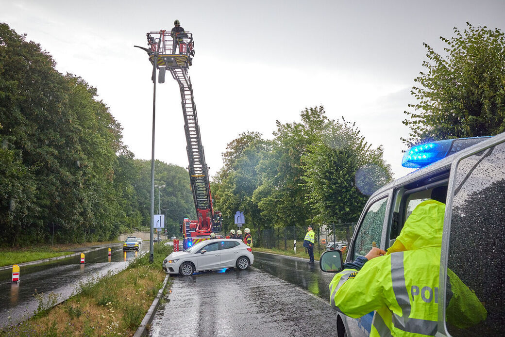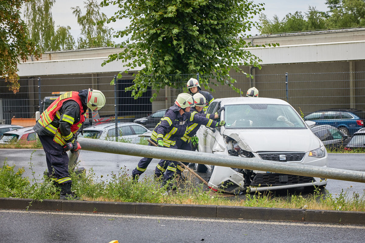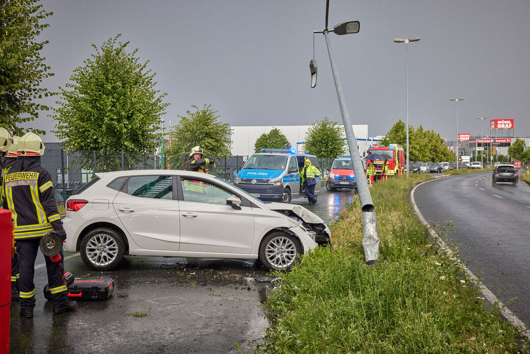 Da der Mast der Laterne nach dem Unfall schief stand, wurde die Feuerwehr alarmiert. Sie legten den Laternenpfahl aus Sicherheitsgründen um. Die weiteren Ermittlungen zu dem Unfall laufen.