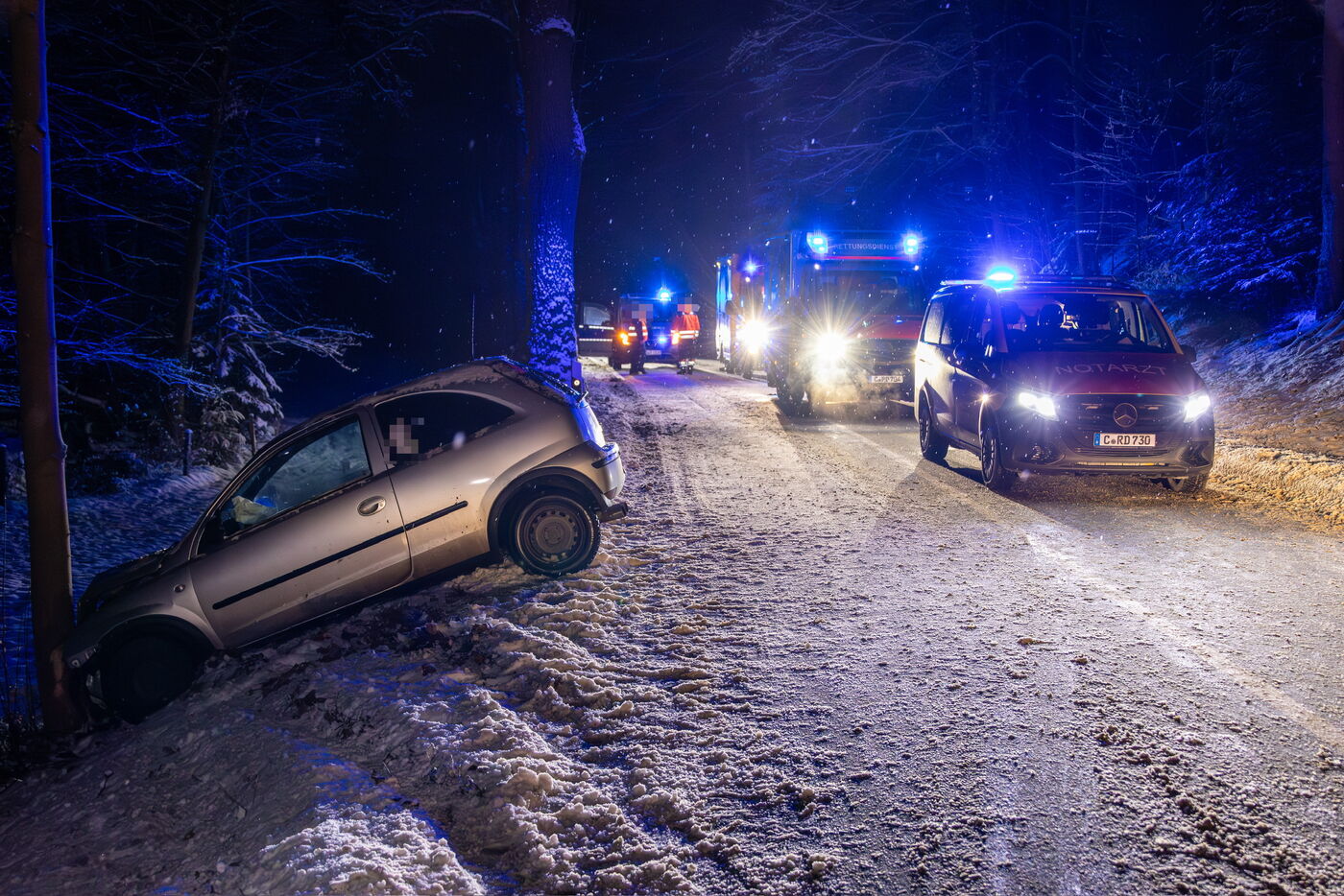 Der Pkw kam von der Fahrbahn ab, rutschte in einen Graben und prallte gegen einen Baum. Fahrer und Beifahrer wurden ins Krankenhaus gebracht. Zwei weitere Insassen blieben unverletzt. Das Auto musste abgeschleppt werden.