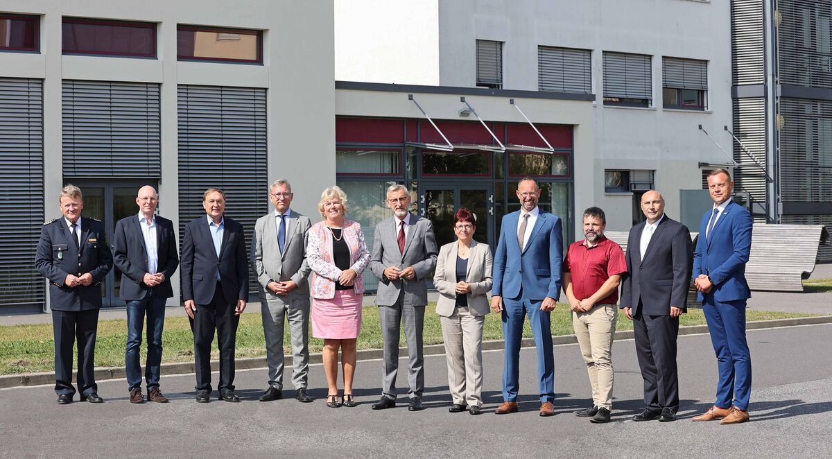v.l.n.r.: Landespolizeipräsident Jörg Kubiessa, Dr. Bruno Bartscher, Prof. Dr. Wille Xylander, Dr. Roland Löffler, Prof. Karoline Starkgraff, Staatsminister Armin Schuster, Kanzlerin Karin Hollstein (gehört nicht dem Fachhochschulbeirat an), Rektor Dirk Benkendorff, Polizeihaupt-kommissar Jan Krumlovsky, Ministerialrat Oliver Möller, Polizeihauptkommissar Maik Ebersbach