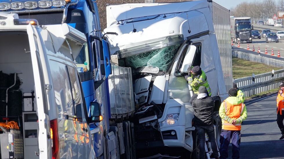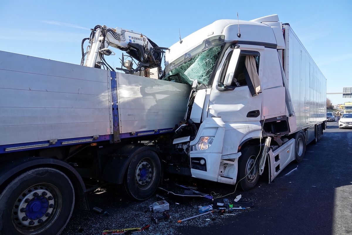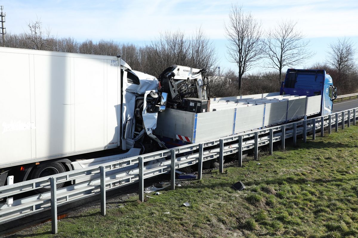 Auf der A4 hat es in der Zufahrt der Autobahnraststätte Dresdner Tor einen schweren LKW-Unfall gegeben. Am frühen Donnerstagmorgen war dort ein Sattelzug auf einen stehenden Laster aufgefahren. Dessen Auflieger, der mit schweren Betonteilen beladen war, bohrte sich ins Fahrerhaus des anderen Lasters und verfehlte den 39-jährigen Trucker nur knapp.