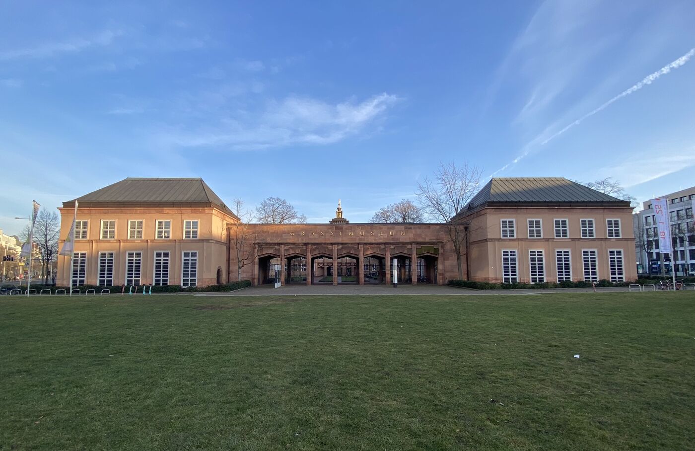 - Die Vorderseite des Leipziger GRASSI-Museums bei blauen Himmel.
