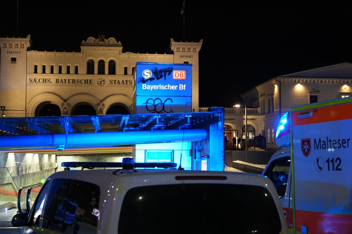 - Polizei und Feuerwehr vor dem Bayerischen Bahnhof.