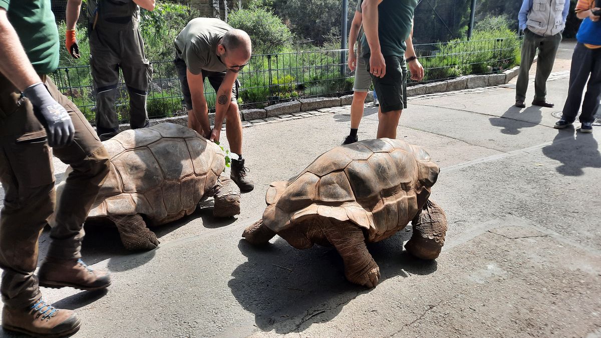 Passend zum Sommerwetter sind die drei Riesenschildkröten im Dresdner Zoo am Montag in ihre Sommerresidenz gezogen. Mit dem Zoomobil wurden die bis zu 200 Kilo schweren Tiere von ihrem Winterquartier an ihr Gehege gefahren. Die letzten Meter ging es dann zu Fuß weiter.