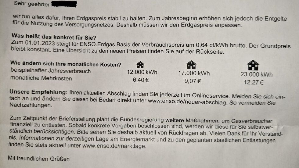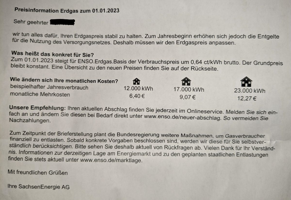 Sachsenenergie schraubt erneut am Gas-Tarif. Die Kunden haben dieser Tage das Informationsschreiben im Briefkasten. Zum 1.Januar 2023 steigt für Enso.Erdgas.Basis-Kunden der Verbrauchspreis um 0,64 Cent brutto pro Kilowattstunde. Der Grundpreis bleibt konstant. Das macht für vierköpfige Familie im Einfamilienhaus mit einem Verbrauch von ca. 17.000 kWh im Jahr etwa 9 Euro mehr im Monat.