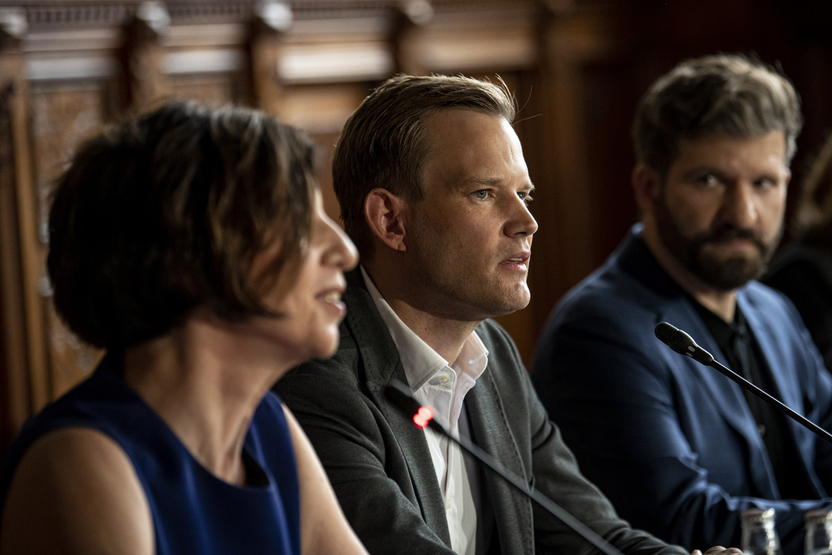 V.l.: Soziologin Jutta Allmendinger, Virologe Hendrik Streeck und Harald Wilkoszewski, Pressesprecher des Wissenschaftszentrums Berlin für Sozialforschung, bei der Pressekonferenz