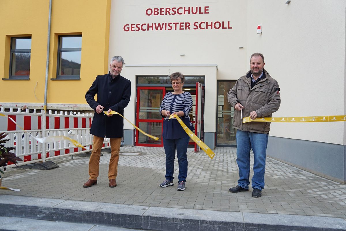 Oberbürgermeister Uwe Rumberg, die stellvertretende Schulleiterin Petra Gläser und Thomas Klingauf vom verantwortlichen Ingenieurbüro eröffnen die Schule