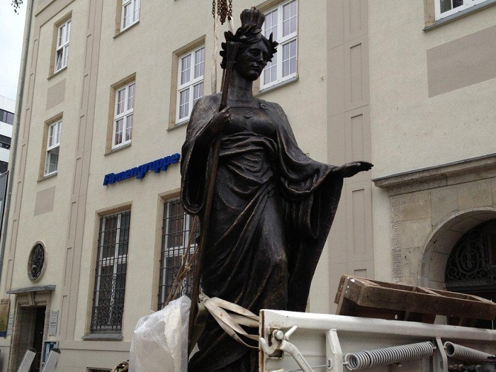 Chemnitz hat ein Stück Geschichte zurück: auf dem Johannisplatz ist am Nachmittag die noch fehlende Figur der Saxonia auf dem gleichnamigen Brunnen enthüllt worden. Die 2,70 Meter hohe Skulptur war im Zweiten Weltkrieg eingeschmolzen worden und ist jetzt nach historischen Fotos komplett neu entstanden. Damit ist der wiederaufgebaute Saxonia-Brunnen komplett: die Figuren des Schmieds und der Spinnerin waren bereits Anfang des Jahres wieder aufgestellt worden.