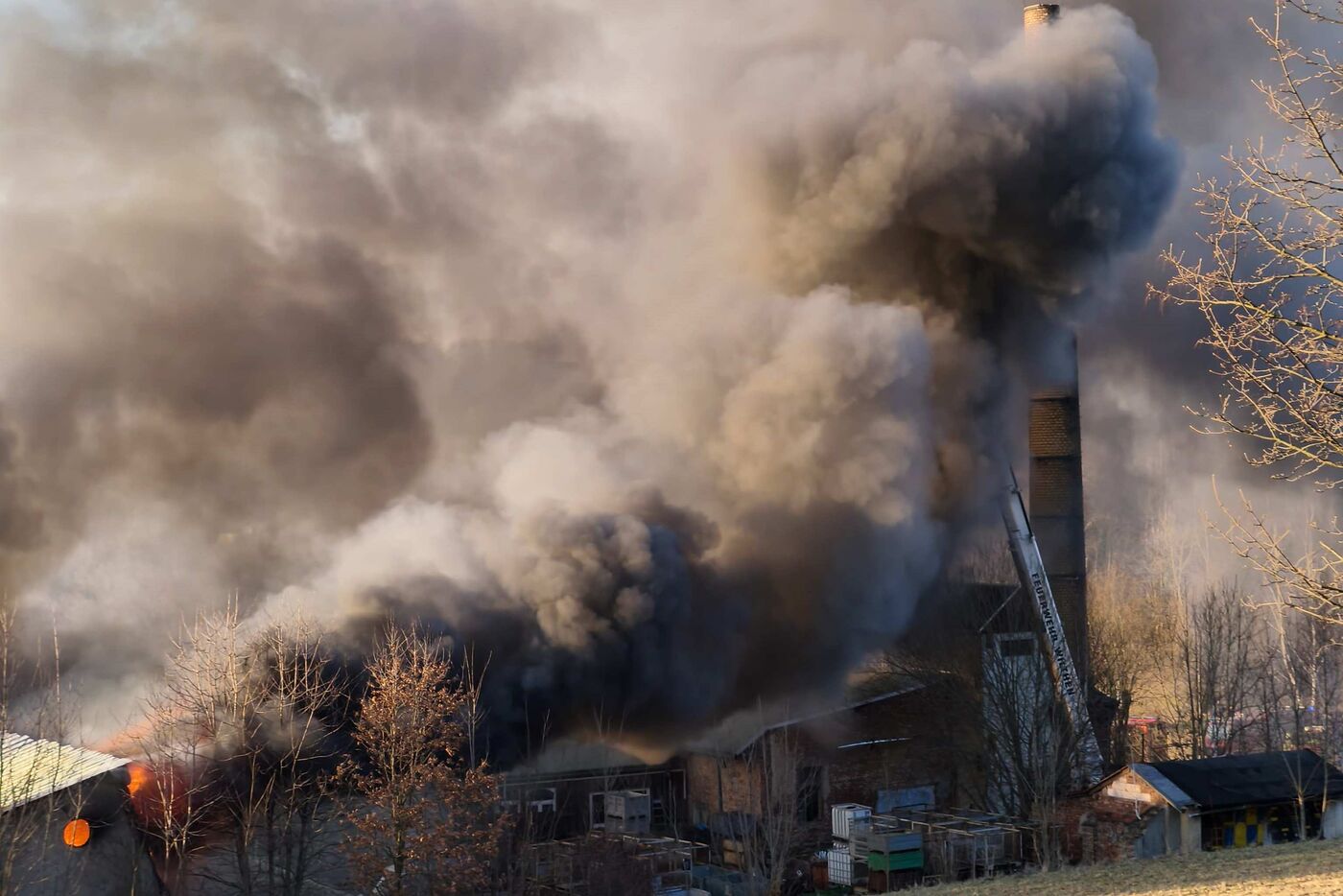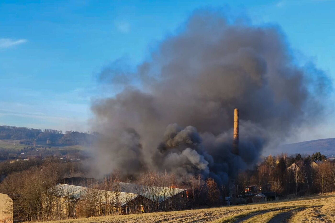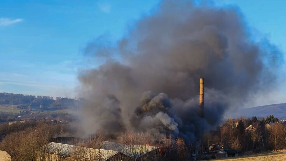 Großbrand in Schirgiswalde-Kirschau. Auf dem Gelände einer ehemaligen Fabrik im Ortsteil Callenberg ist am Nachmittag ein Feuer ausgebrochen. Nach ersten Informationen steht ein Gebäude in Flammen. Schwarze Rauchwolken ziehen über den Ort.
