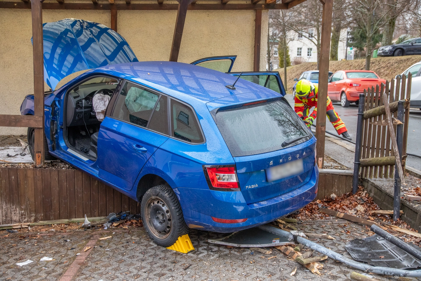 Der blaue Skoda steht schräg in einem Carport, die Türen offen, das Holzgerüst eingedrückt. Im Innenraum haben Airbags ausgelöst.