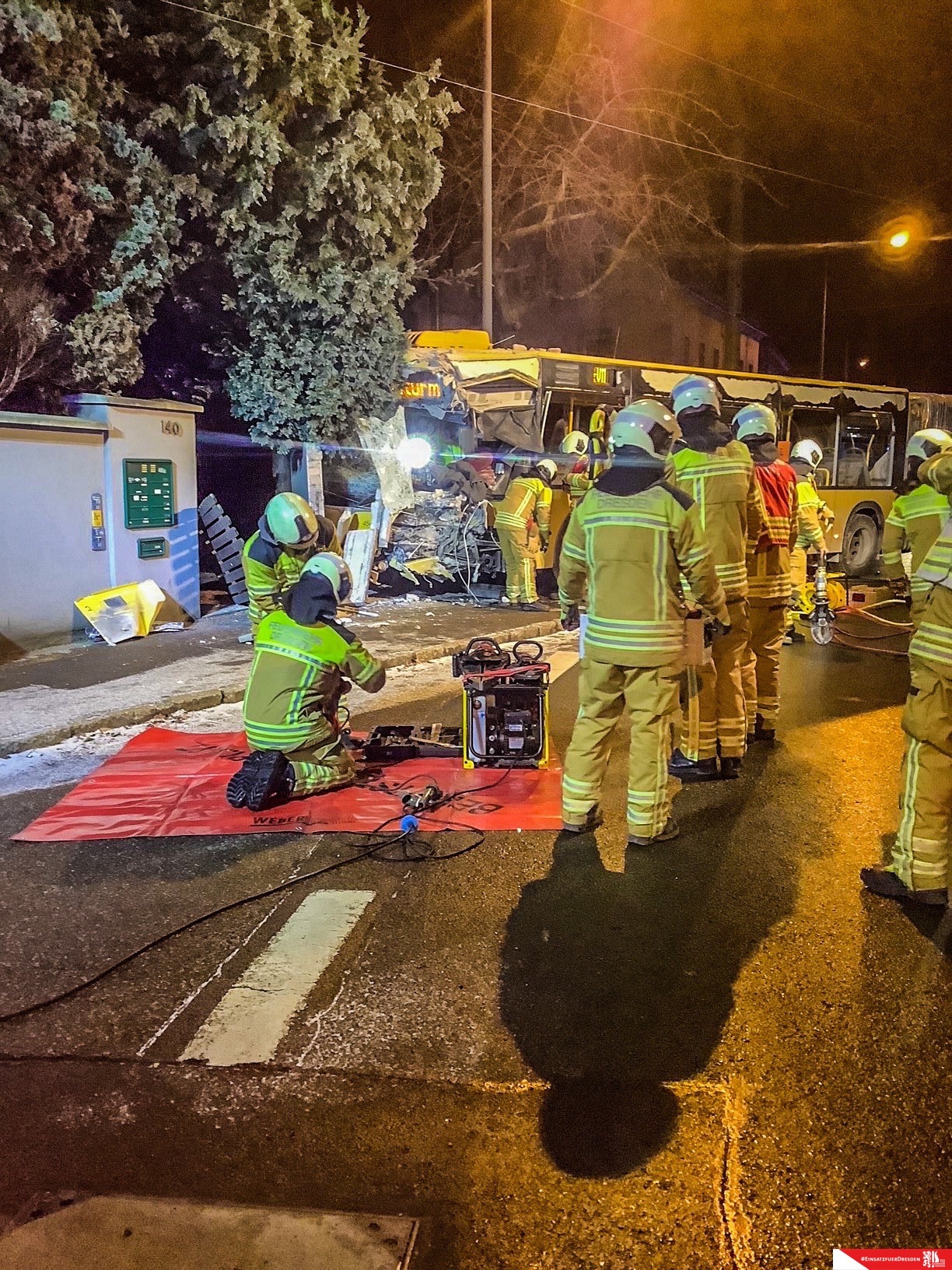 Schwerer Unfall in Dresden: Linienbus kracht gegen Bäckerei