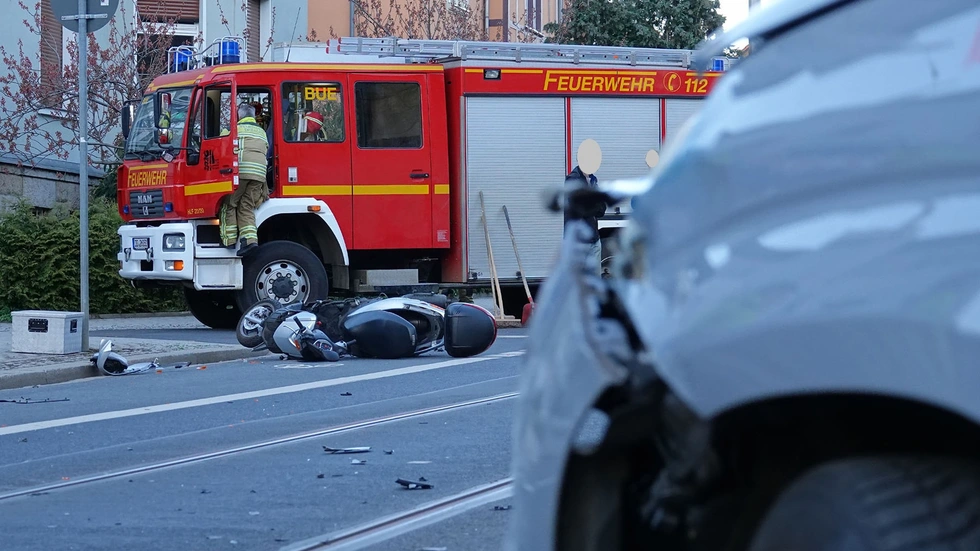 Am Mittwochabend kam es auf der Bautzner Landstraße in Dresden zu einem schweren Verkehrsunfall. Nach bisherigen Erkenntnissen unseres Reporters stieß ein Motorroller mit einem gerade wendenden Fiat Panda zusammen, der vermutlich den Motorroller hinter sich übersehen hatte.