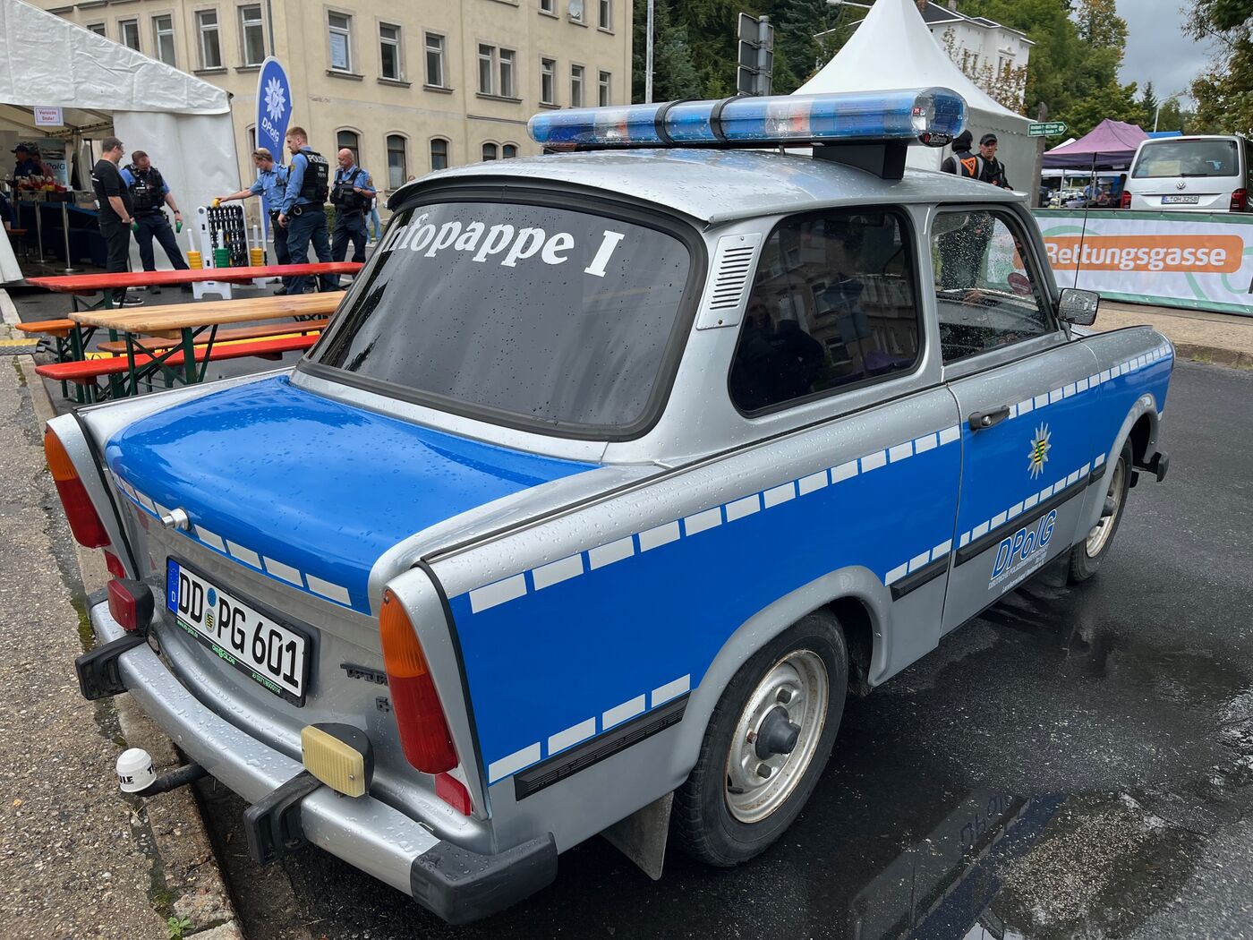 Der Polizei-Trabi, die sogenannte "Infopappe", steht direkt an der Blaulichtmeile
