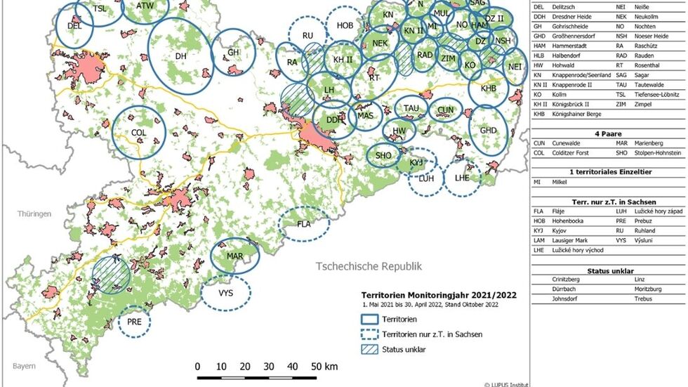 Wölfe erobern Sachsen. Es gibt sieben neue Territorien. Das geht aus den heute vorgelegten Daten des Monitoringjahres 2021/2022 hervor. Neu ist demnach ein Rudel in Tiefensee-Löbnitz in Nordsachsen. Wolfspaare wurden im Colditzer Forst, in Marienberg und Stolpen-Hohenstein nachgewiesen – und in der Oberlausitz drei neue Rudel in Zimpel und der Noeser Heide im Kreis Görlitz sowie eins in Tautewalde im Kreis Bautzen.
