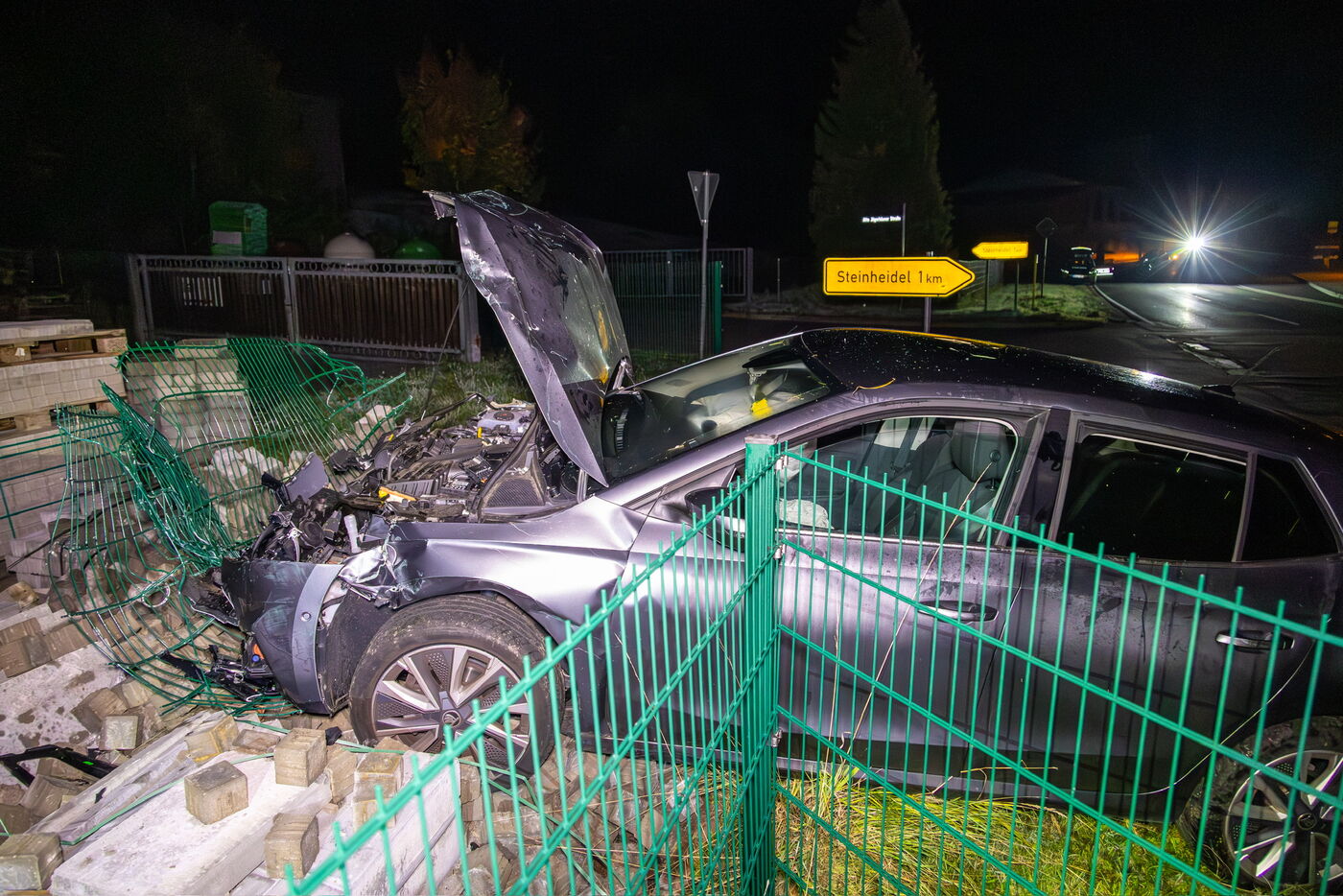 Der Wagen kam von der Fahrbahn ab, kollidierte mit einem Verkehrszeichen, durchbrach den Zaun eines Firmengeländes und kam schließlich an einer Palette mit Straßenpflaster zum Stehen.