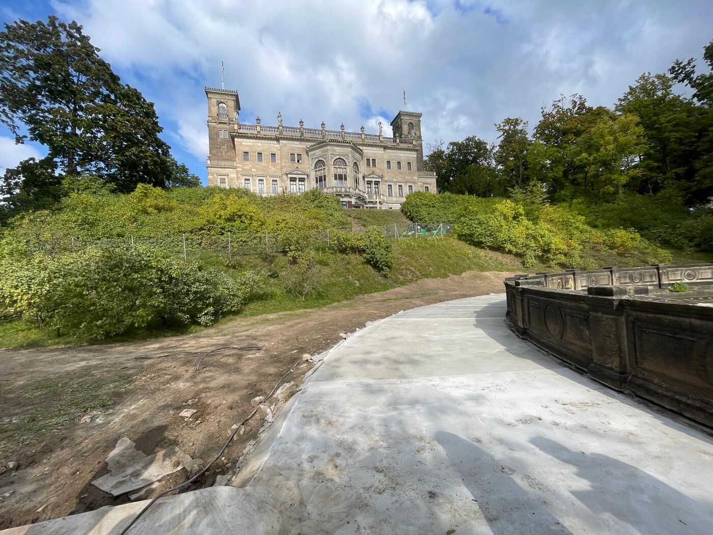 Oberhalb der sogenannten Kolonnaden wurde die Abdichtung komplett erneuert. Das war notwendig geworden, weil durch Risse in der Abdeckung Wasser ins Bauwerk eingedrungen war und den Sandstein angegriffen hatte.