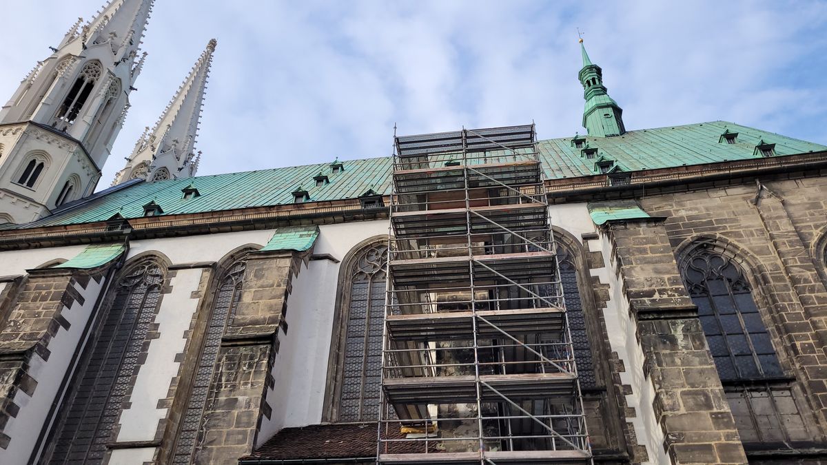 Die Sonnenuhr an der Görlitzer Peterskirche wird restauriert. In dieser Woche wurde das Gerüst aufgestellt. Der historische Zeitmesser wird bald wieder lesbar sein und die Uhrzeit anzeigen. Er wurde vom Görlitzer Universalgelehrten Bartholomäus Scultetus entworfen. Seit 1567 befindet sie sich an der Peterskirche, dem Wahrzeichen von Görlitz.