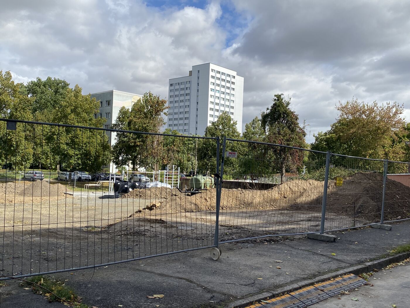 Die Baugrube für den neuen Spiel-Fitness-Park an der Samuel-Lampel-Straße in Leipzig-Mockau.