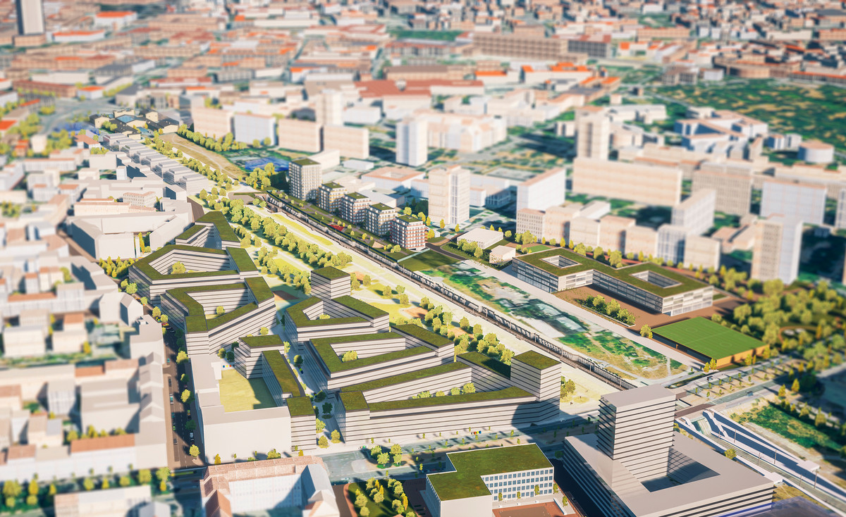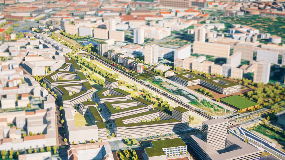 Östlich der Bahntrasse sollen fünf Mehrfamilienhäuser entstehen. Sie werden barrierefrei gebaut und mit Dachgrün und Photovoltaik ausgestattet. Auf dem Areal soll zudem ein mehr als 5.000 Quadratmeter großer Stadtteilpark mit Spielbereichen für Kinder angelegt werden. Die Baukosten betragen rund 80 Millionen Euro.