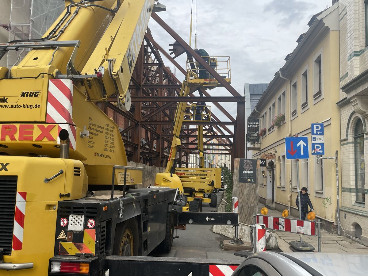 Über zwei Jahre hat es die Peter-Breuer-Straße in Zwickau geprägt. Die Rede ist von dem großen Stahlgerüst, das die historische Fassade der ehemaligen Druckerei Förster & Borries abgestützt hat. Seit Montagmorgen ist eine Spezialfirma im Einsatz, die das Gerüst zurückgebaut. Das wird voraussichtlich zwei Wochen dauern. So lange bleibt die Breuerstraße für den Verkehr gesperrt.