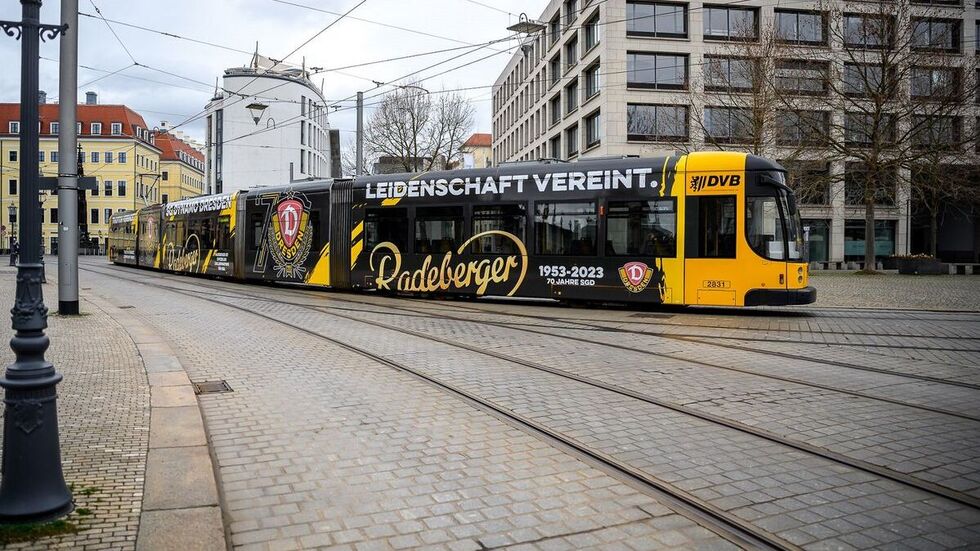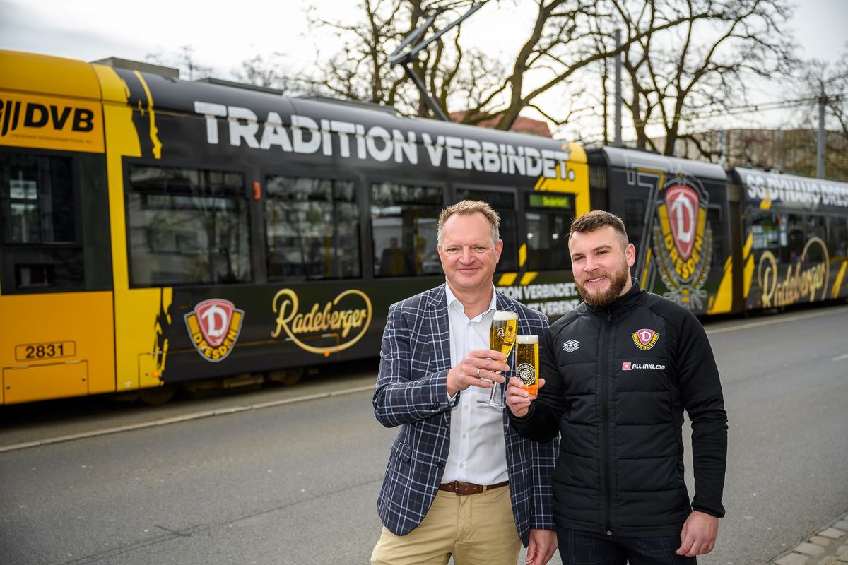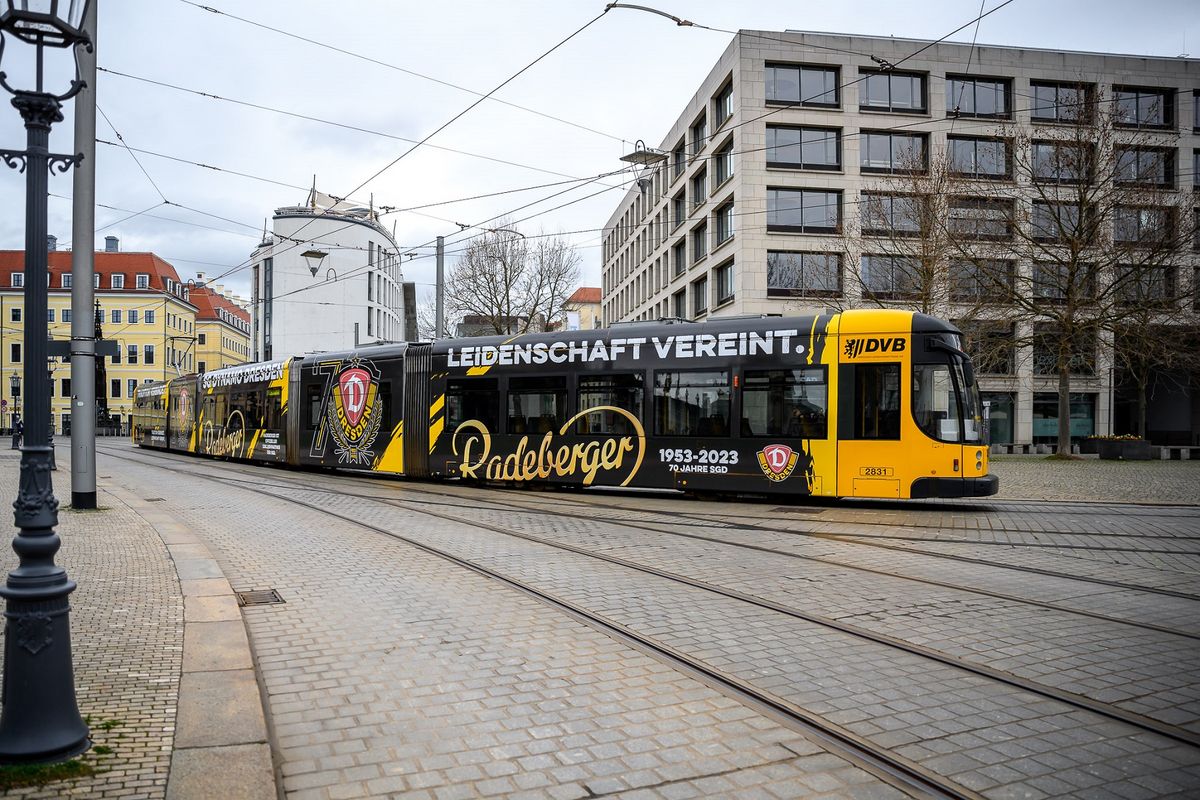Die Radeberger Brauerei und Dynamo Dresden haben am Freitag eine im Partnerlook gestaltete Straßenbahn der DVB eingeweiht. Feierlicher Anlass war der bevorstehende 70. Geburtstag der SGD am 12. April 2023.