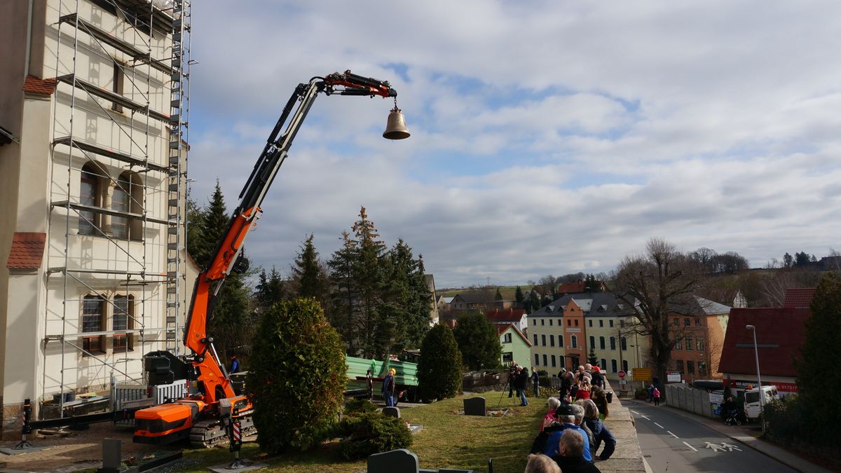 Viereinhalb Monate nach ihrer feierlichen Weihe sind die neuen Glocken der Auferstehungskirche Stenn am Mittwoch in den sanierten Turm gehoben worden. Das halbe Dorf war auf den Beinen, um das besondere Ereignis zu verfolgen.
