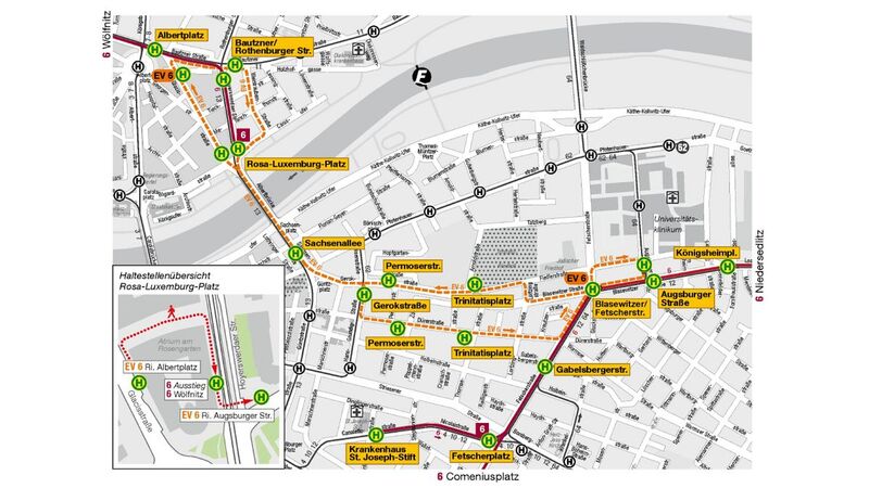 Betroffen ist der Abschnitt zwischen der Rosa-Luxemburg-Straße und der Blasewitzer/Fetscherstraße. Die Linie 6 wird geteilt und endet von Niedersedlitz bzw. Wölfnitz kommend an diesen Haltestellen. Wer weiterfahren will, muss in den Ersatzbus umsteigen. Am 20. März soll die Linie 6 dann wieder zum Normalbetrieb zurückkehren.